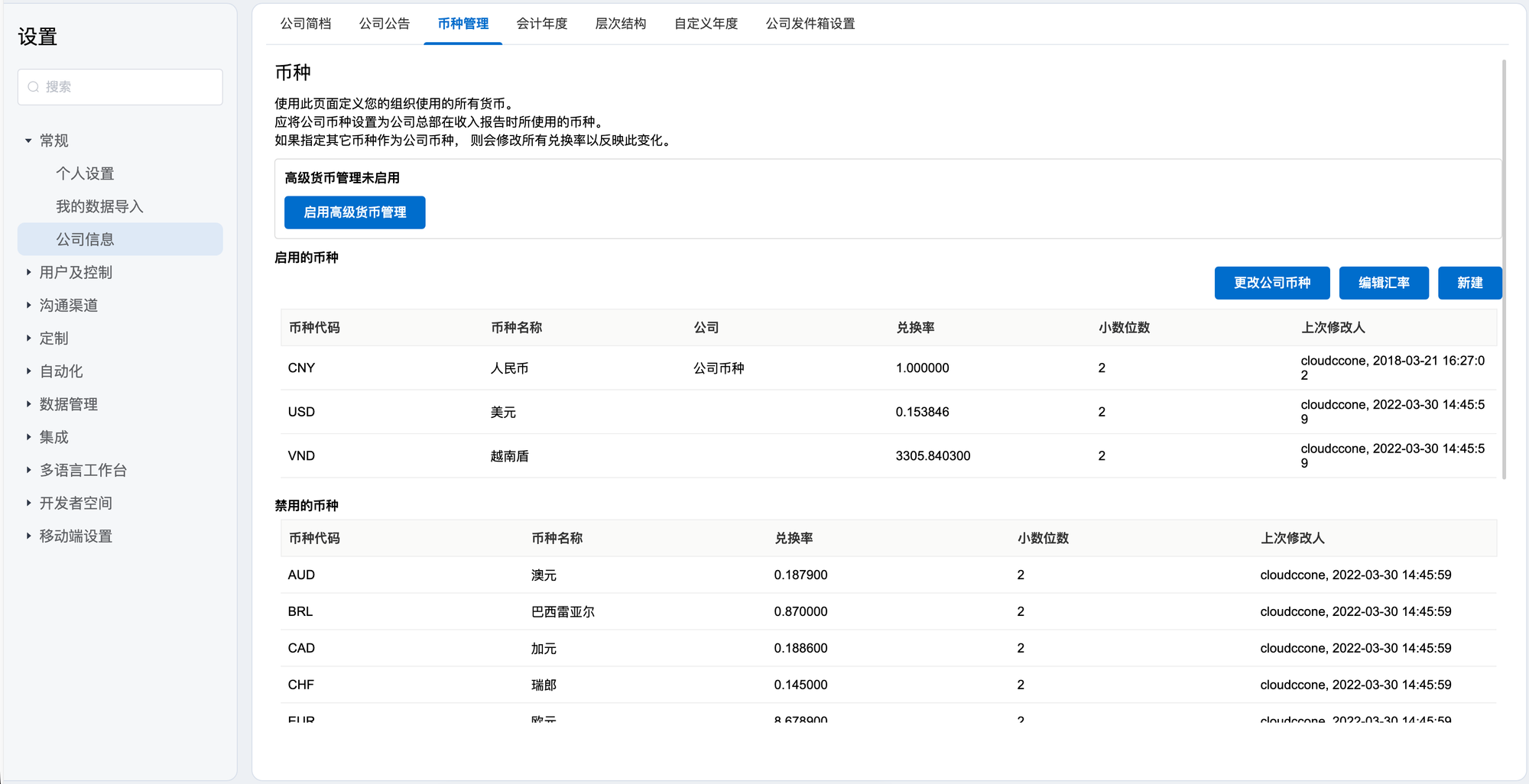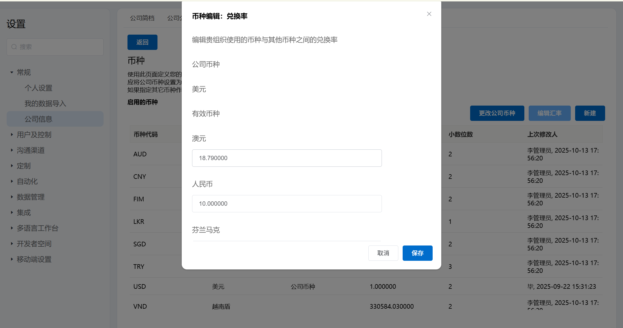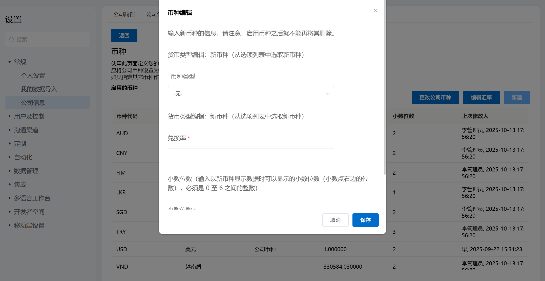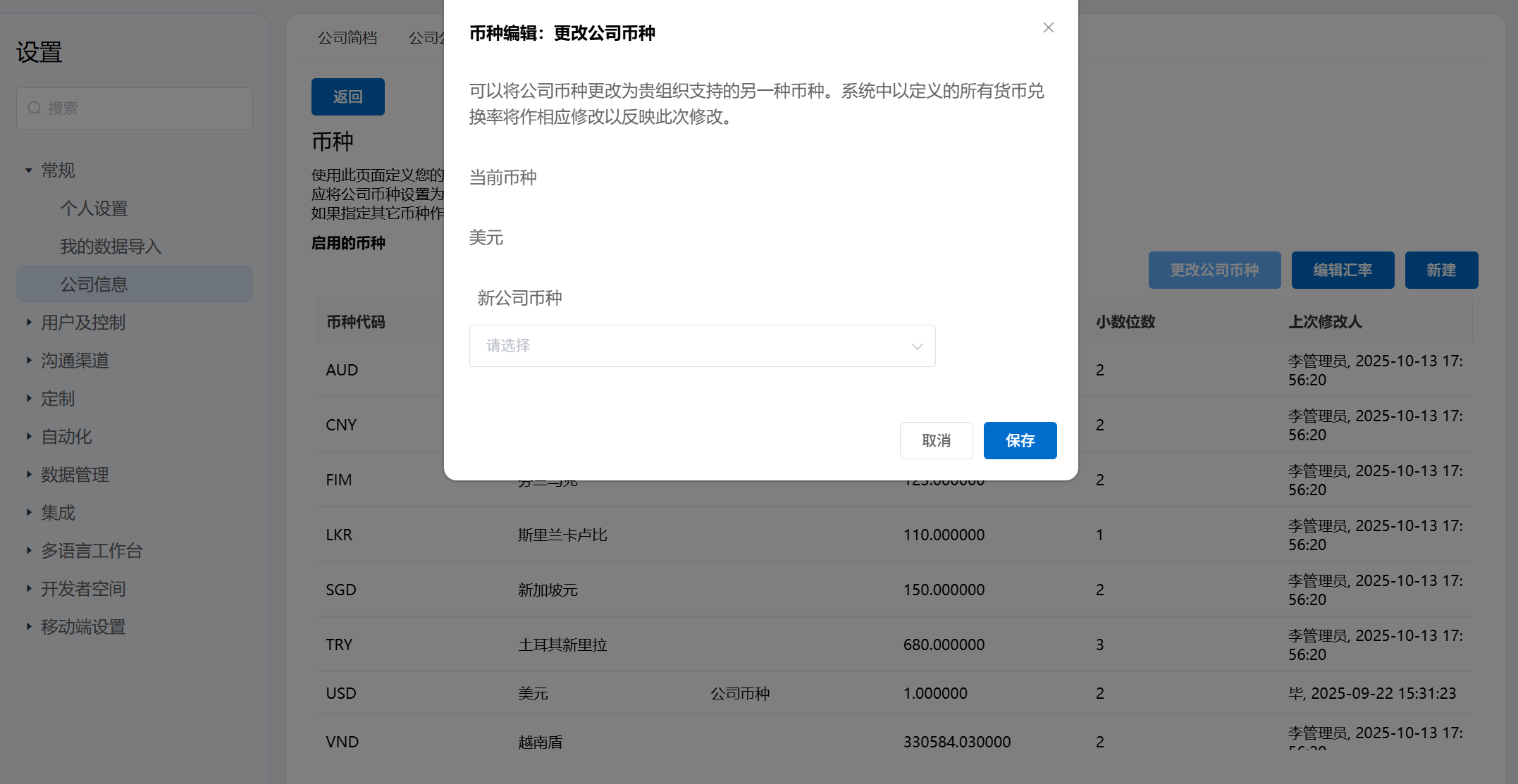 - 通过点击更改公司币种,可以选择新币种作为公司币种。