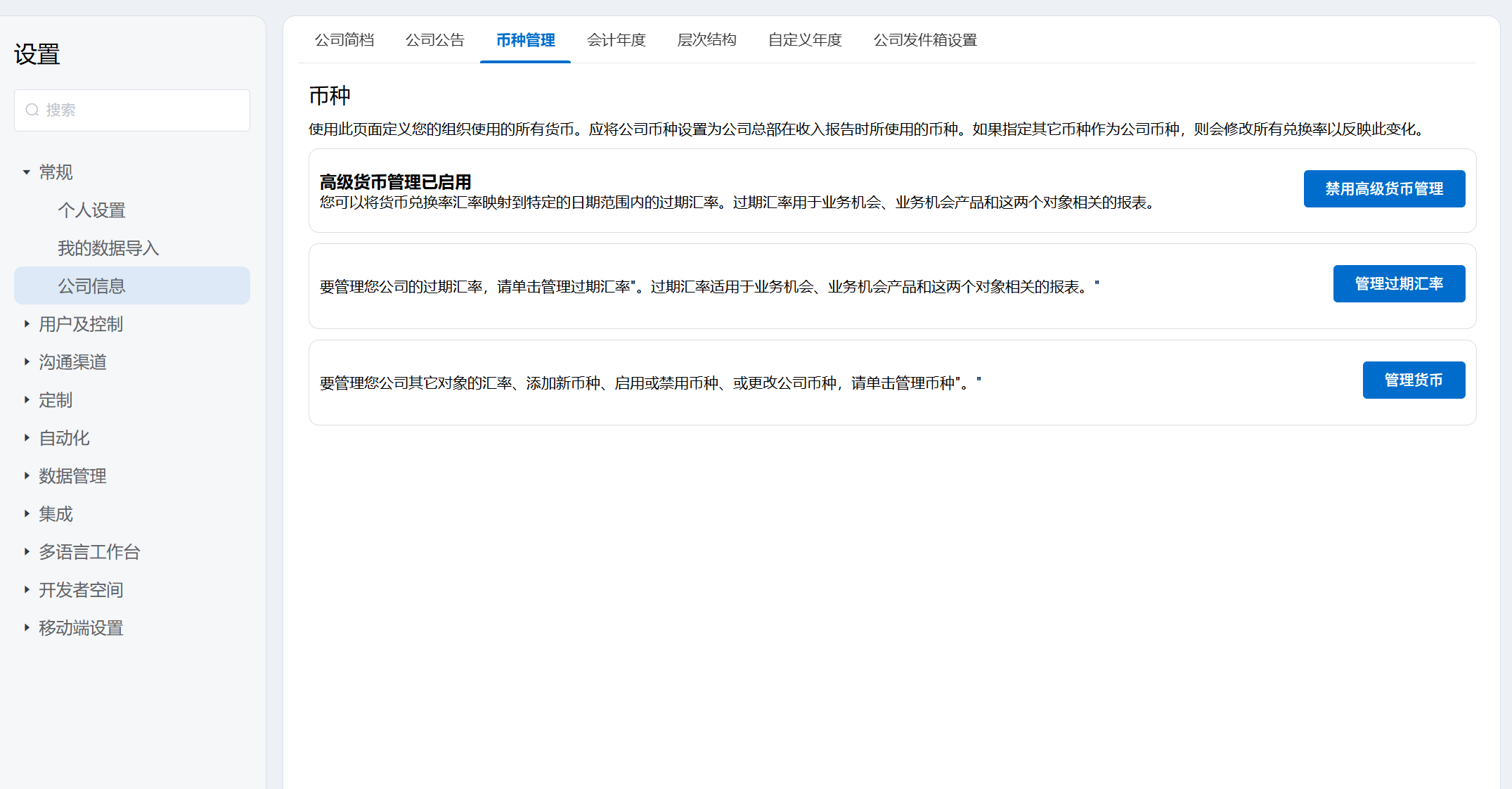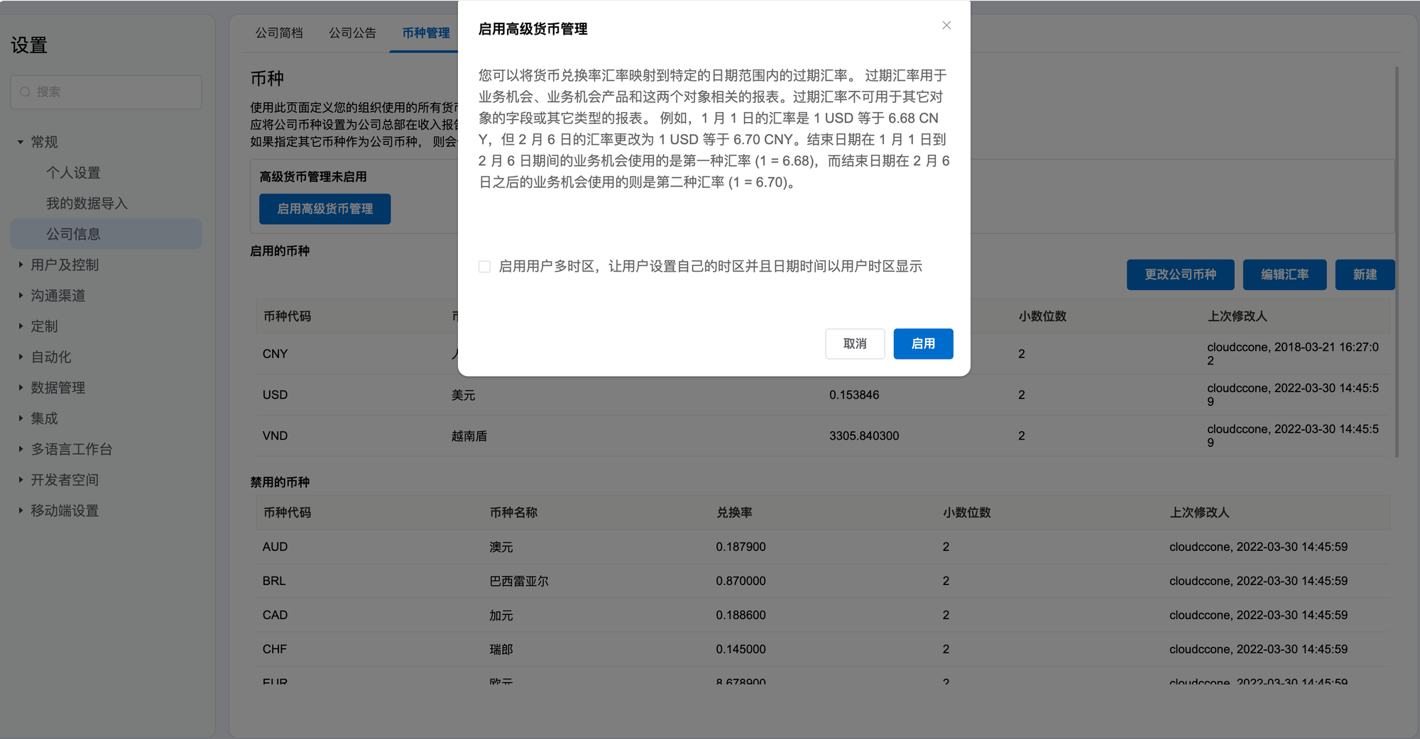CloudCC CRM的多货币功能可以帮助您轻松处理全球市场的业务交易。如果您经常接触国际客户和供货商,那么多货币将促成国际买卖。您可以通过此页面来根据用户的基础货币来跟进业务机会,同时实现货币类型与汇率的管理。