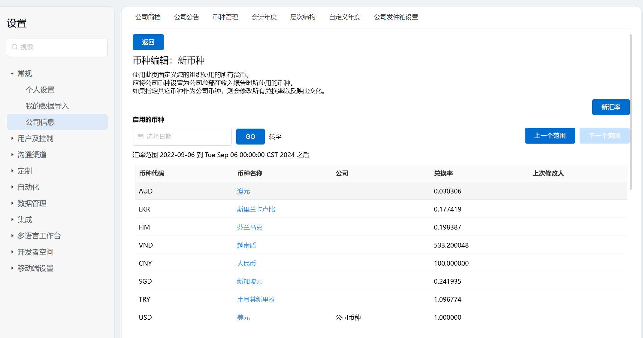 - 点击新建,可以增加新的货币种类,设置该币种基于公司货币的比率。