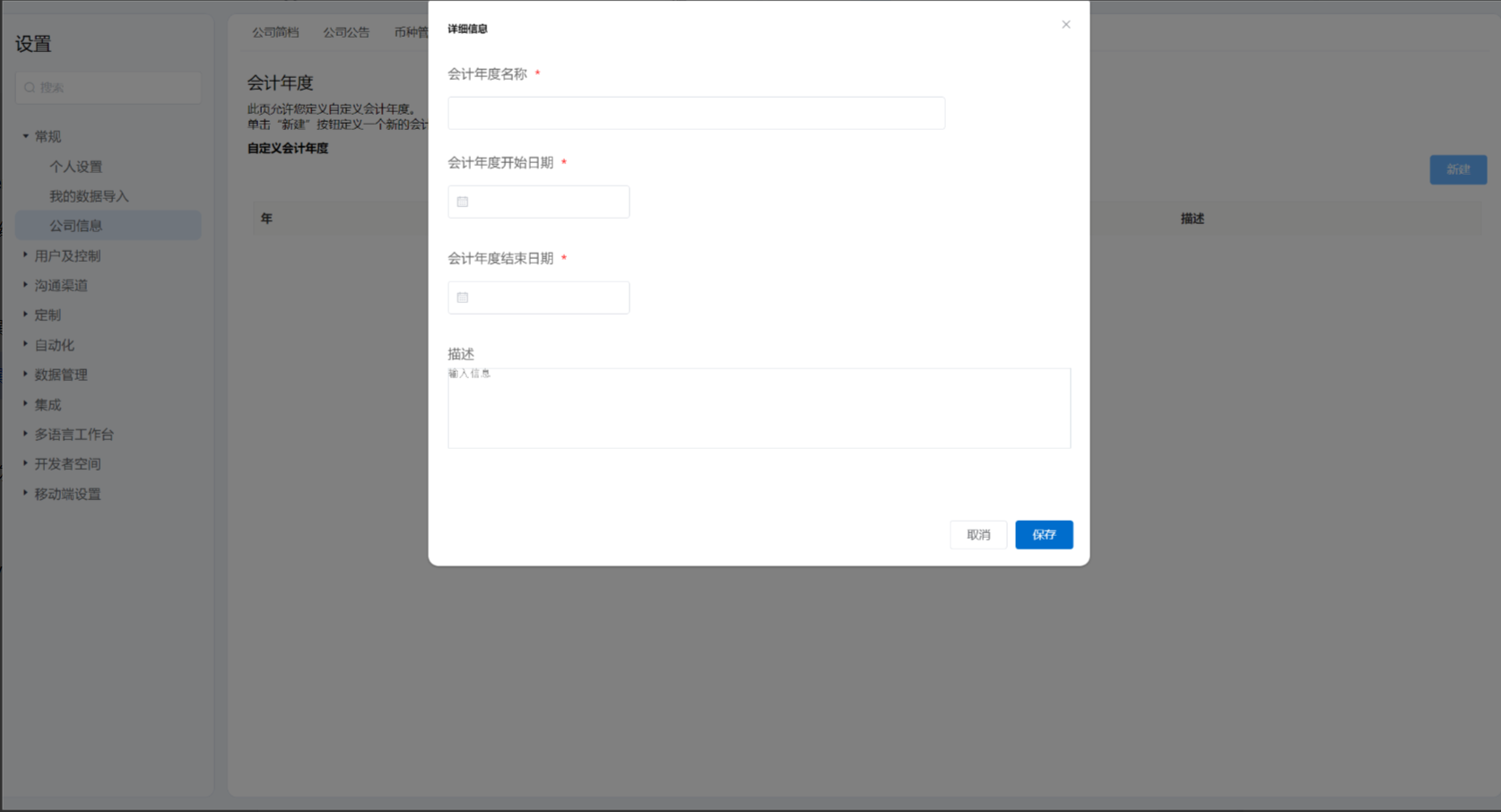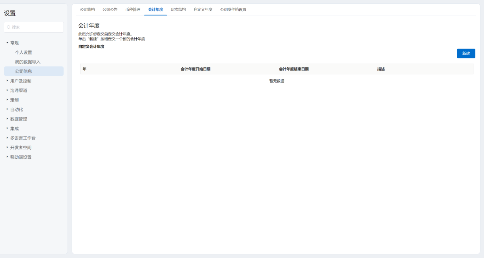 - 点击新建按钮,输入相关信息,可以为企业设定财年的开始月份。