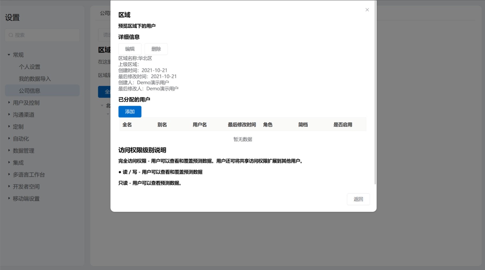 对于区域层次结构,您需要定义不同区域层级,并将其分配给用户。一个用户一次只能关联一个区域,下图为新增区域内用户。