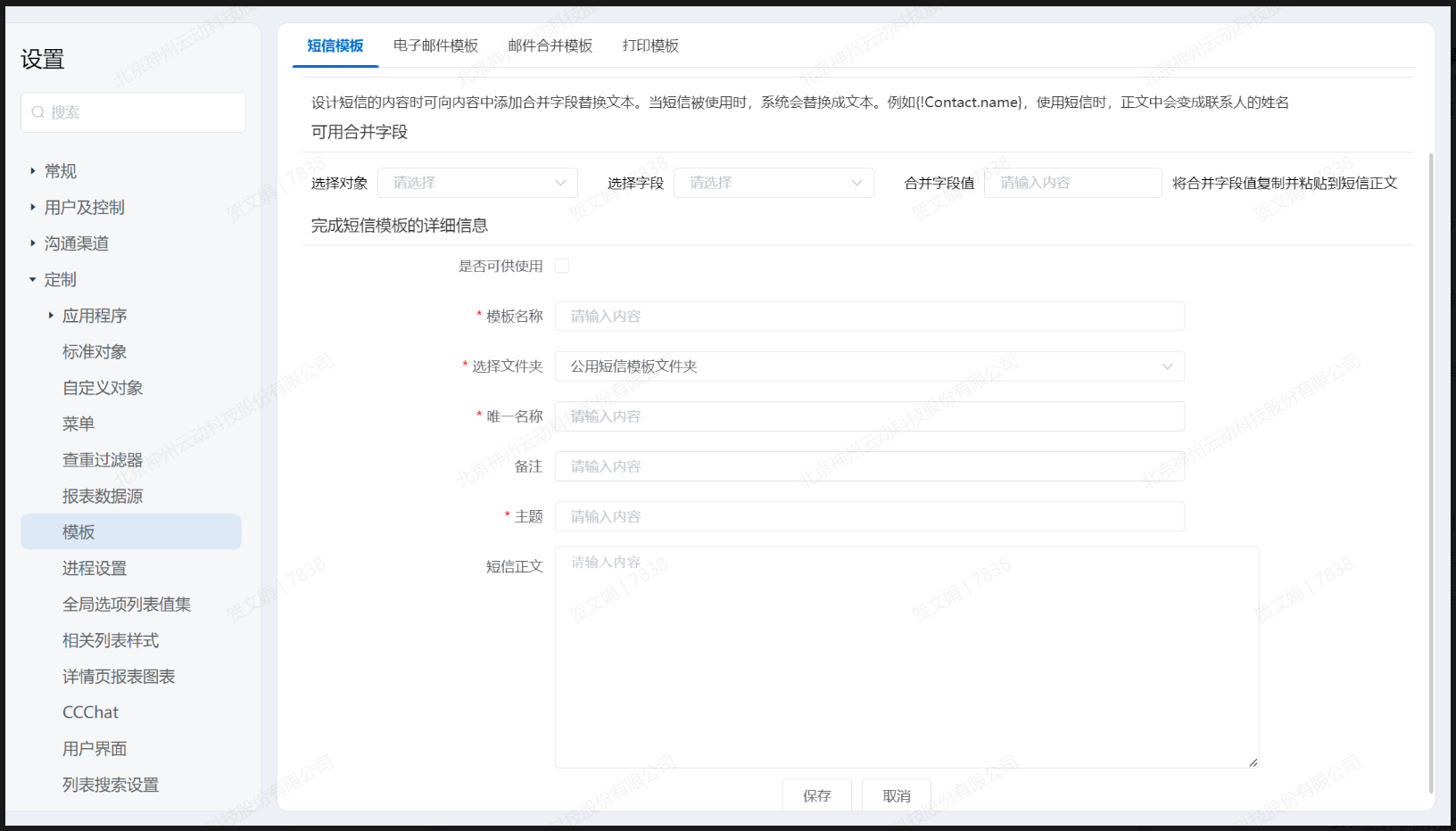 - 点击“新建”打开新建短信模板页面,设置是否可供使用,填写模板名称、唯一名称、短信主题,撰写短信正文,正文中可插入对象的字段,点击“保存”即可完成短信模板的创建。