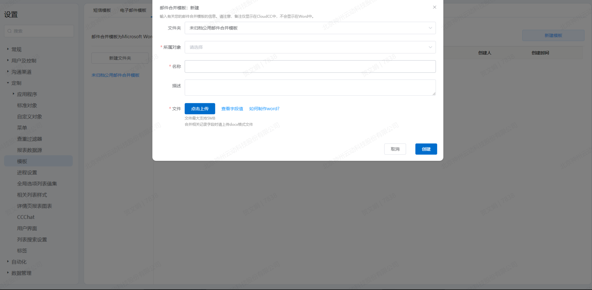 输⼊模板名称、所属⽂件夹、所属对象、模板描述等信息,上传模板⽂件