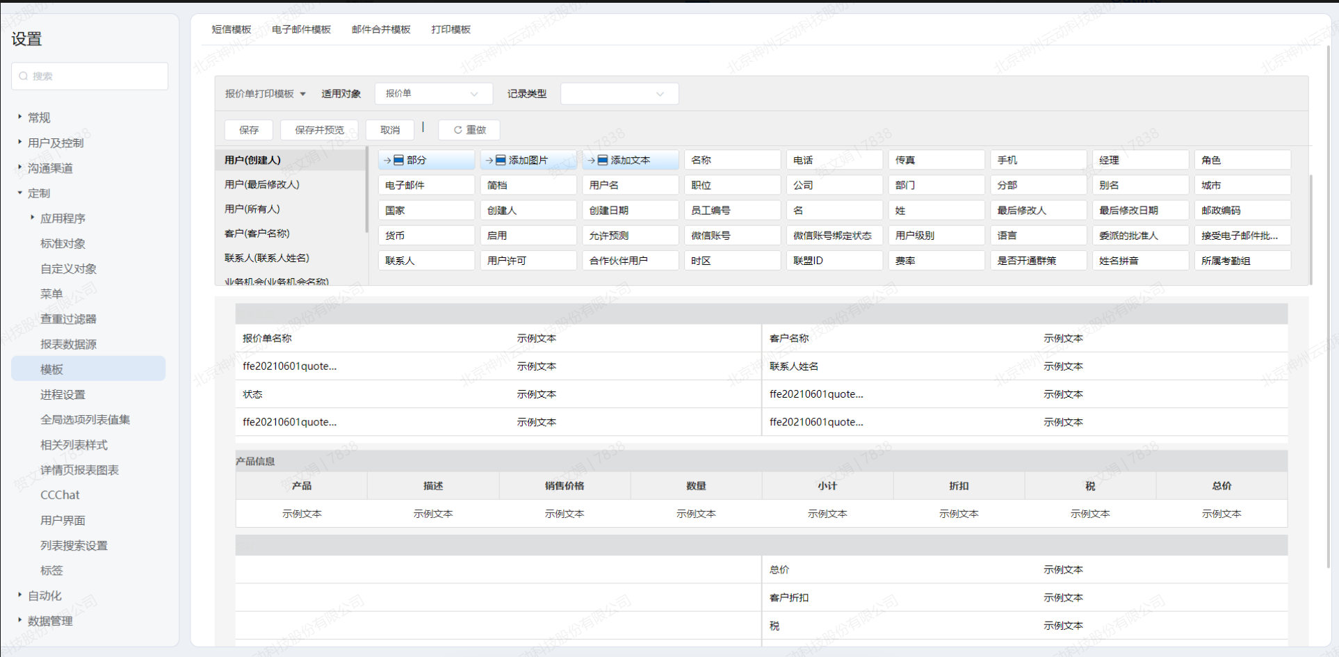 - 点击“保存”进入打印模板设计页面,选择再打印模板上的字段,部分、图片等数据,添加完成之后可保存和保存并预览,完成打印模板的创建。