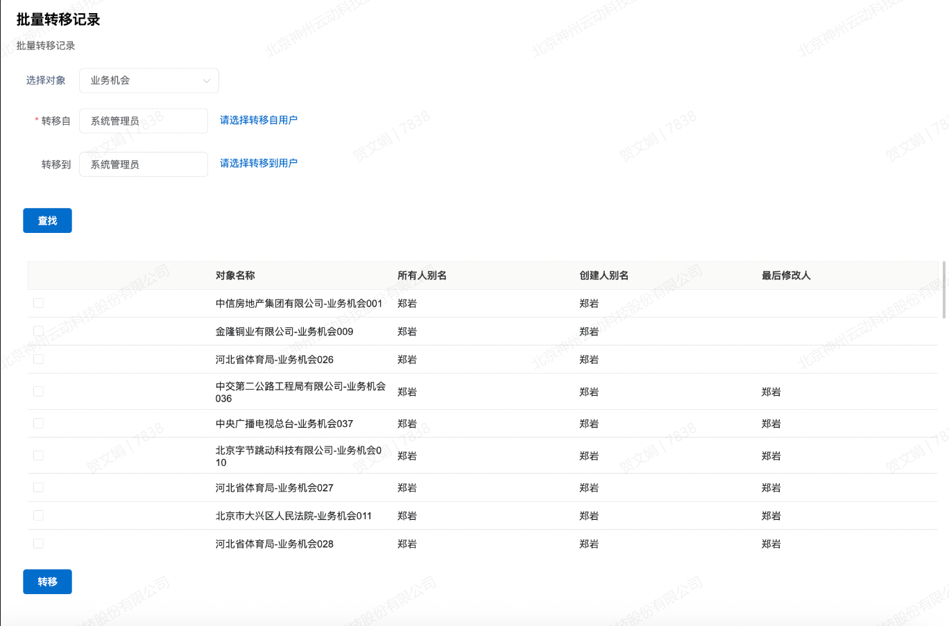 数据管理 批量转移记录 为了方便用户在离职或因岗位变动交接工作,平台提供批量转移记录的功能,支持快速的将所有记录转移到新的用户名下。操作步骤选择要转移记录的所属对象,被转移的用户名及接受被转移记录的用户名点击“查找”,可以查看上述条件所拥有的记录数及详细情况勾选要转移的记录,点击“转移”按钮,即可完成批量转移操作 Previous Next