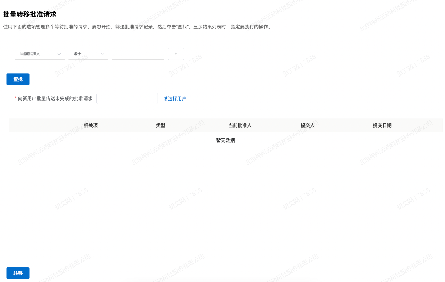 数据管理 批量转移批准请求 当平台中用户离职或工作岗位变动,导致在进行的批准请求无法执行的时候,管理员可在批量转移批准请求中查找筛选请求记录,并将进行的批准请求批量转移到新用户名下。操作步骤填写选项管理,按照需求筛选条件点击查找,找到要转移的审批请求选择要接收未完成的审批请求的用户勾选并点击“转移”按钮 Previous Next