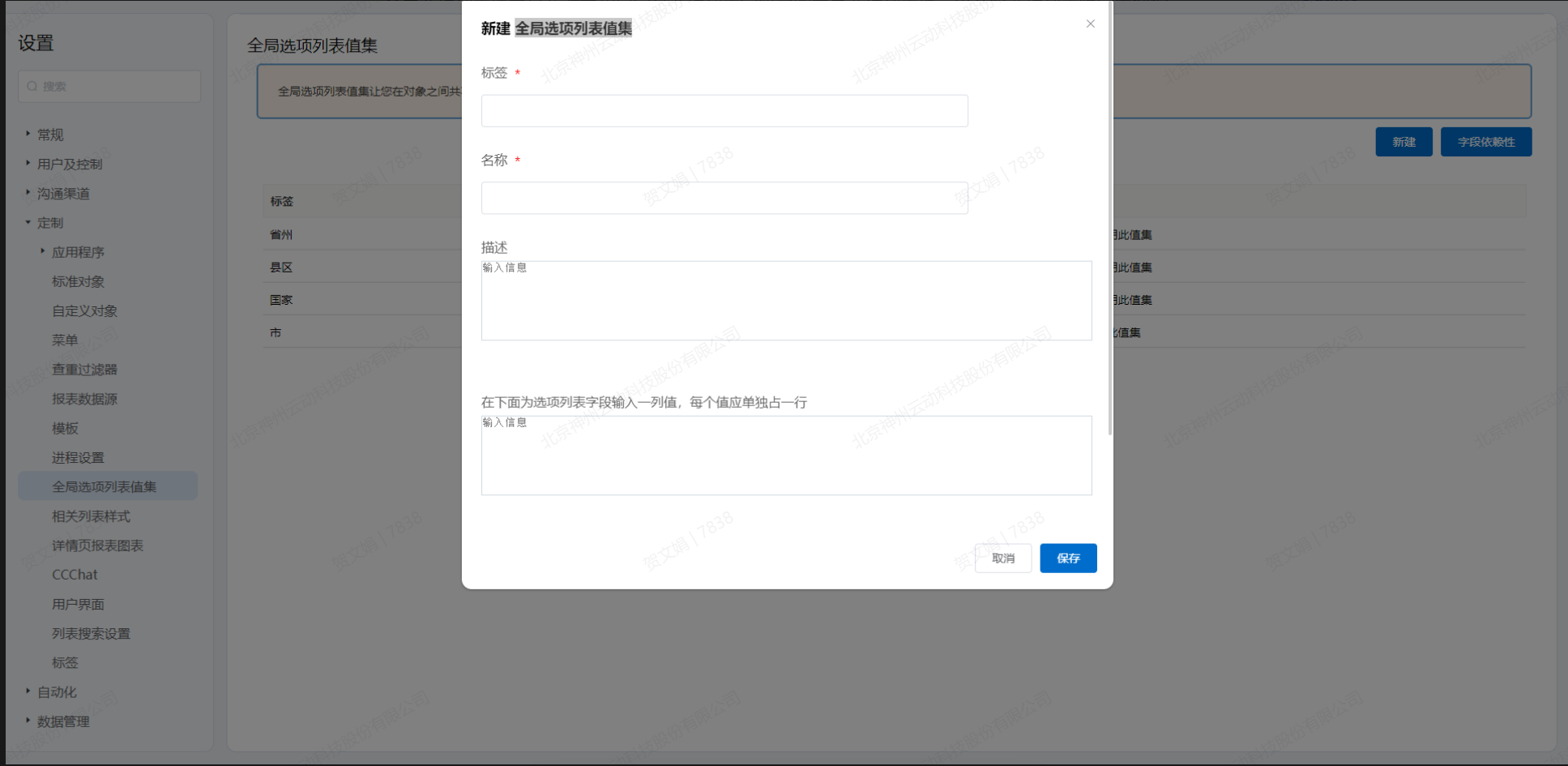 全局选项列表值集是在对象和自定义选项列表字段之间共享选项列表值,以及将选项列表限定为您指定的值。与自定义选项列表字段不同,全局选项列表作为全局选项列表值集单独存在。其值与基于该列表的任何选项列表共享。全局选项列表的性质为“受限”选项列表,只有CloudCC管理员可以添加或修改其值。