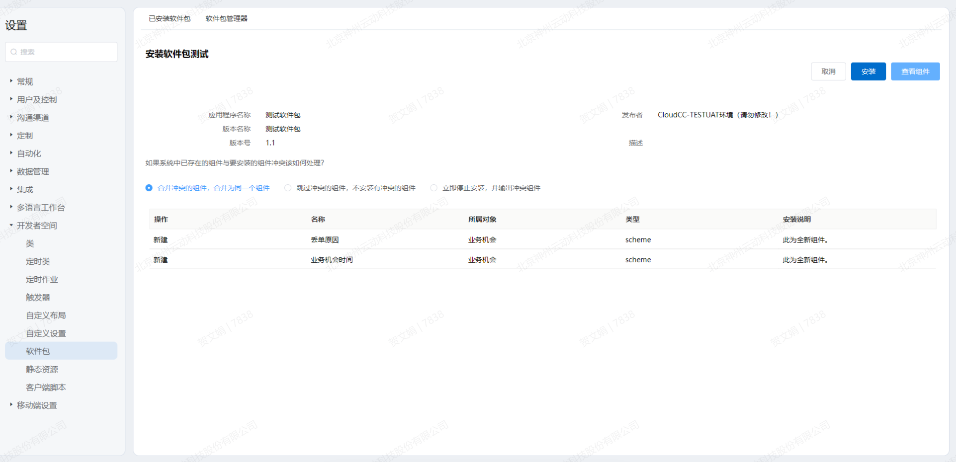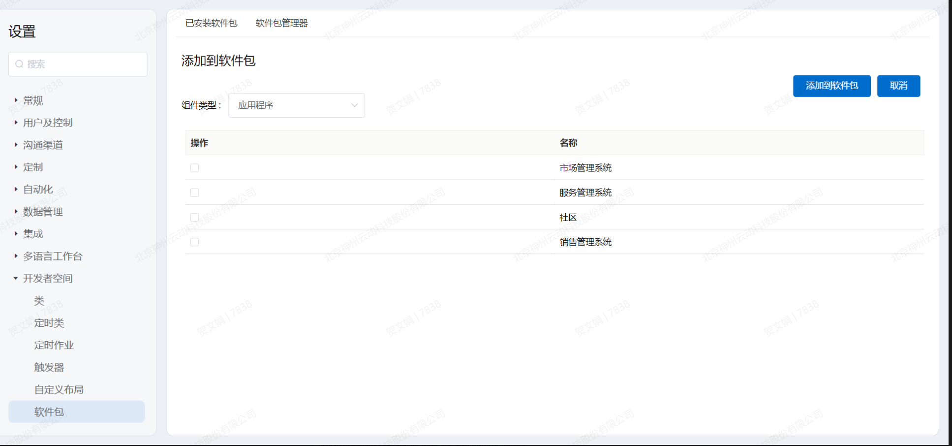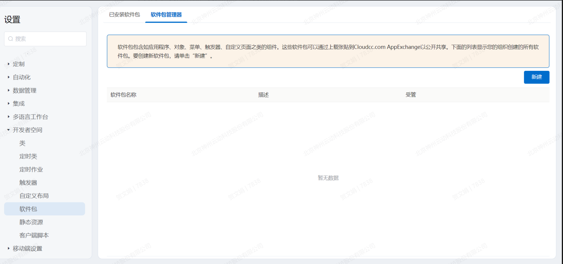 为了帮助开发与实施人员快速地将配置好的系统迁移到正式环境或其他环境,平台为组织提供了软件包功能,开发人员与实施人员通过对平台开发好的类、自定义页面、自定义组件、应用程序等直接打包成软件包,开发人员通过平台返回的软件包地址,在新环境上直接安装开发好的功能。