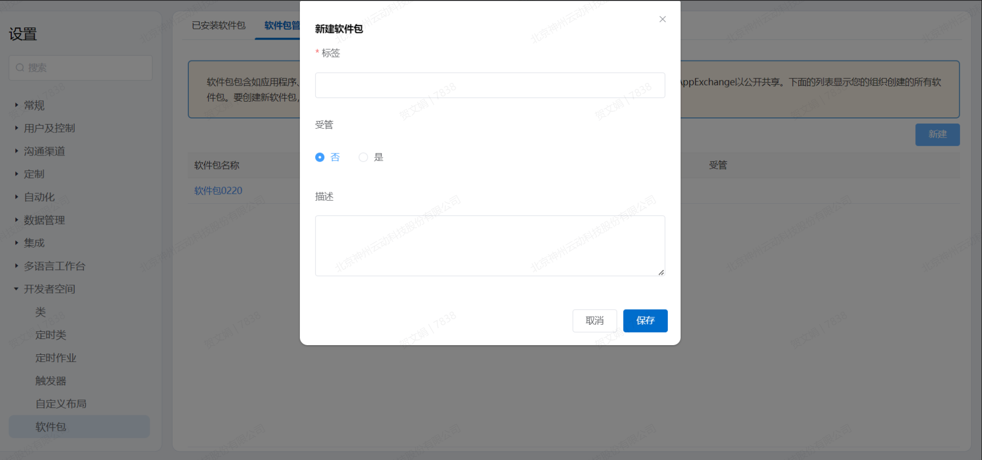 - 新建:在打开的对话框中命名软件包,添加描述信息,保存后即完成创建