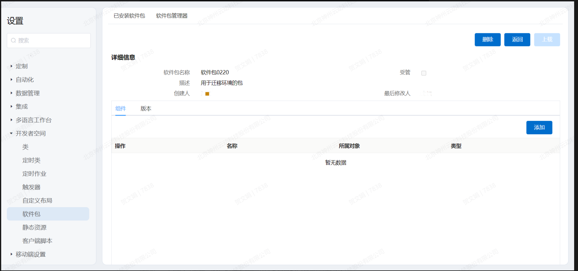 软件包详细信息页中包含了基本信息、版本信息以及组件信息,在组件栏中可以为软件包添加多种类型的组件