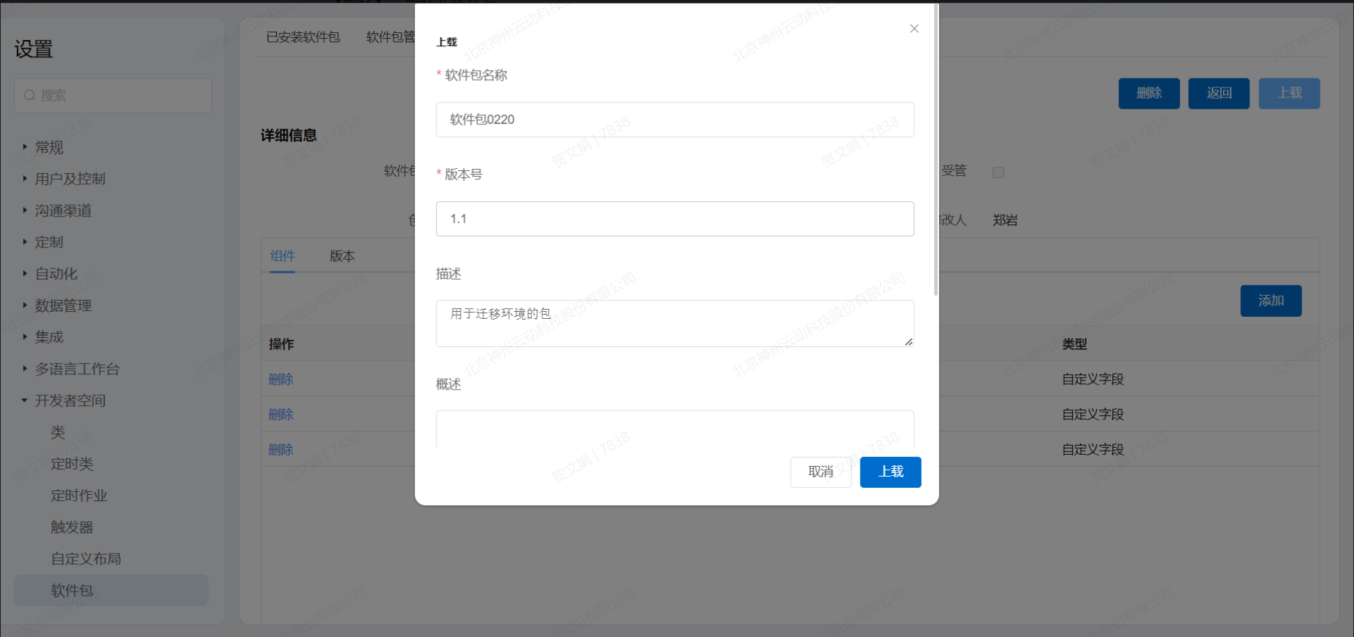 - 上载:在对话框中编辑软件包的信息,点击上载将添加的组件上传到软件包中