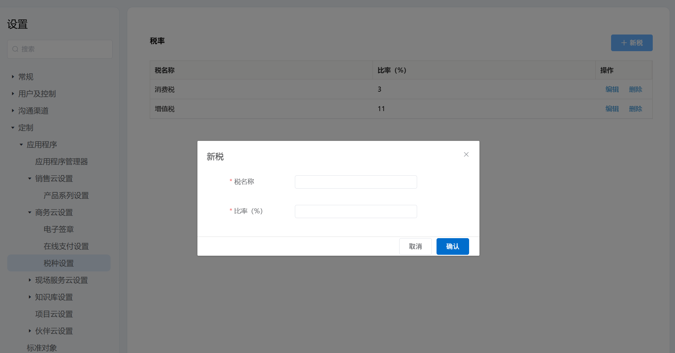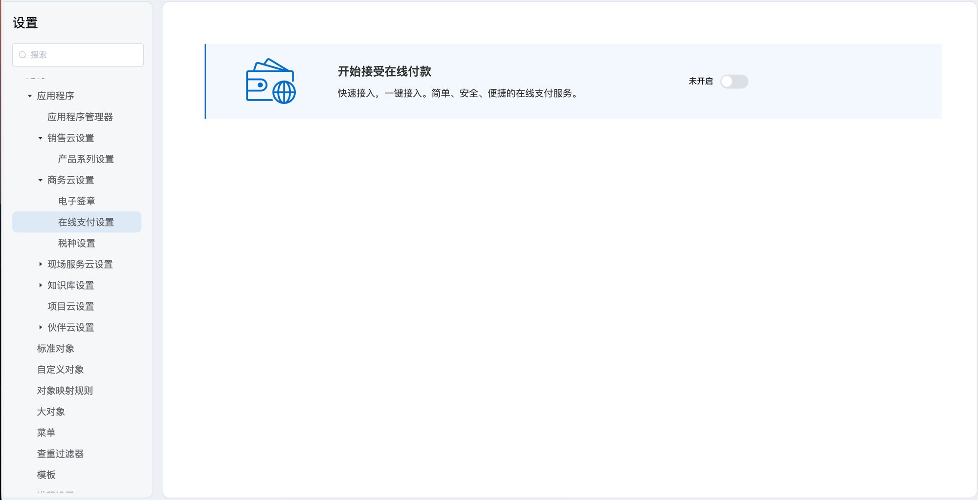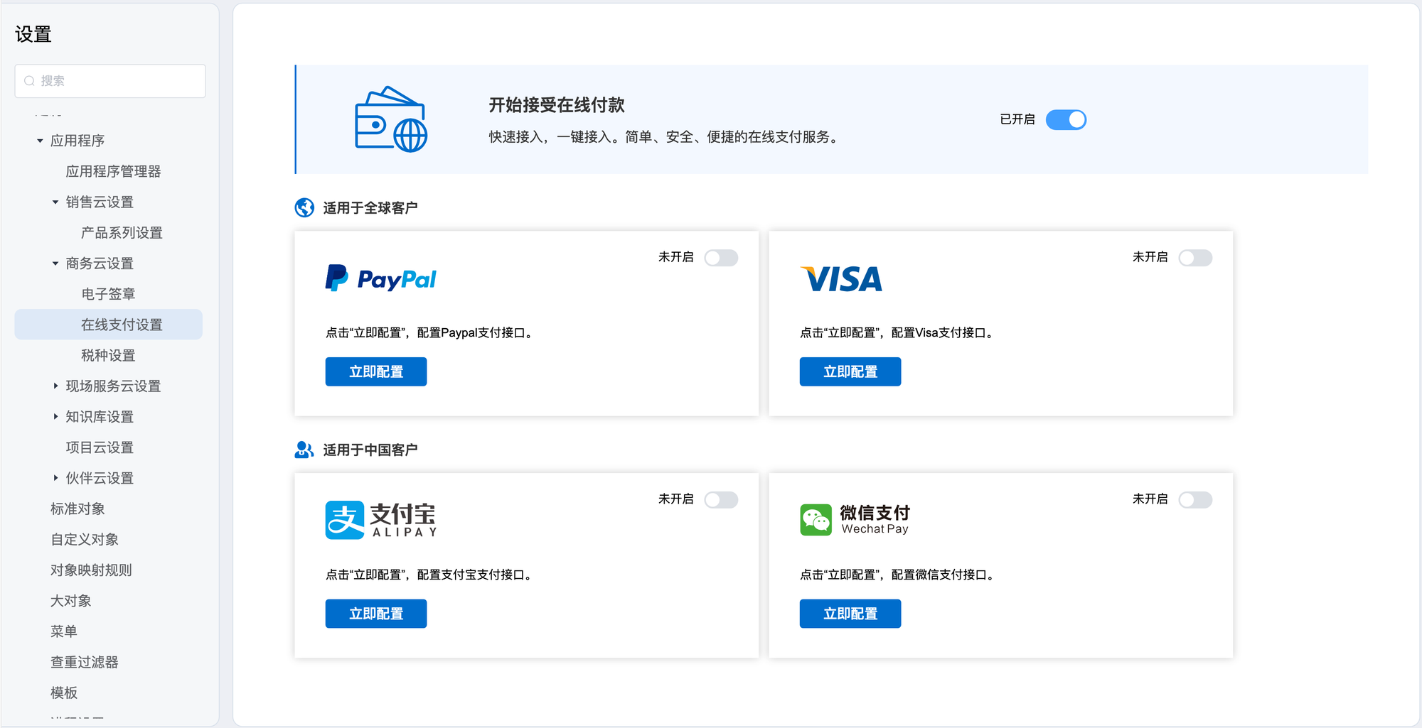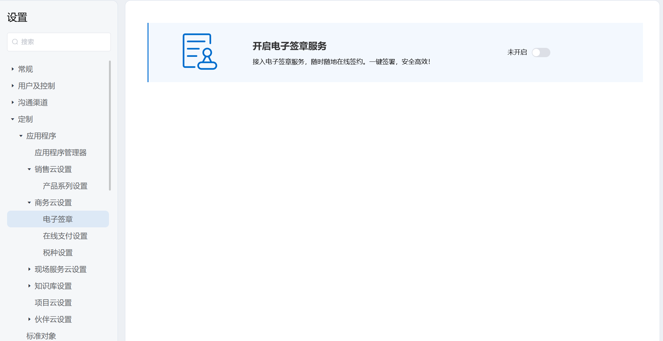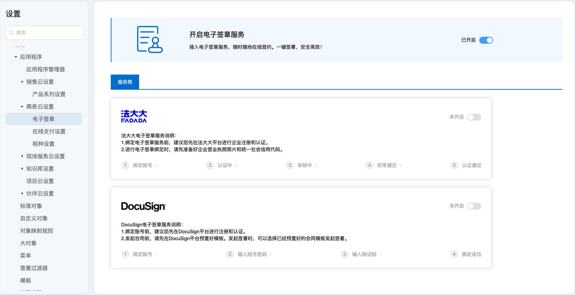 应用程序 商务云设置 1.电子签章接入电子签章服务,随时随地在线签约。一键签署,安全高效!开启前:开启后:支持两种服务:需提前注册账号然后绑定2.在线支付设置快速接入,一键接入。简单、安全、便捷的在线支付服务。开启前:开启后:支持四种服务:需提前注册账号然后配置3.税种设置 Previous Next