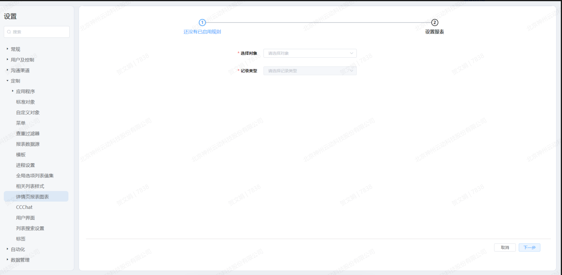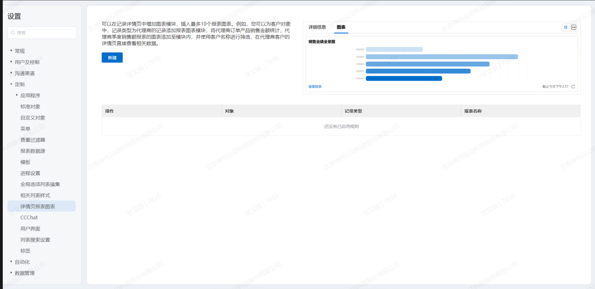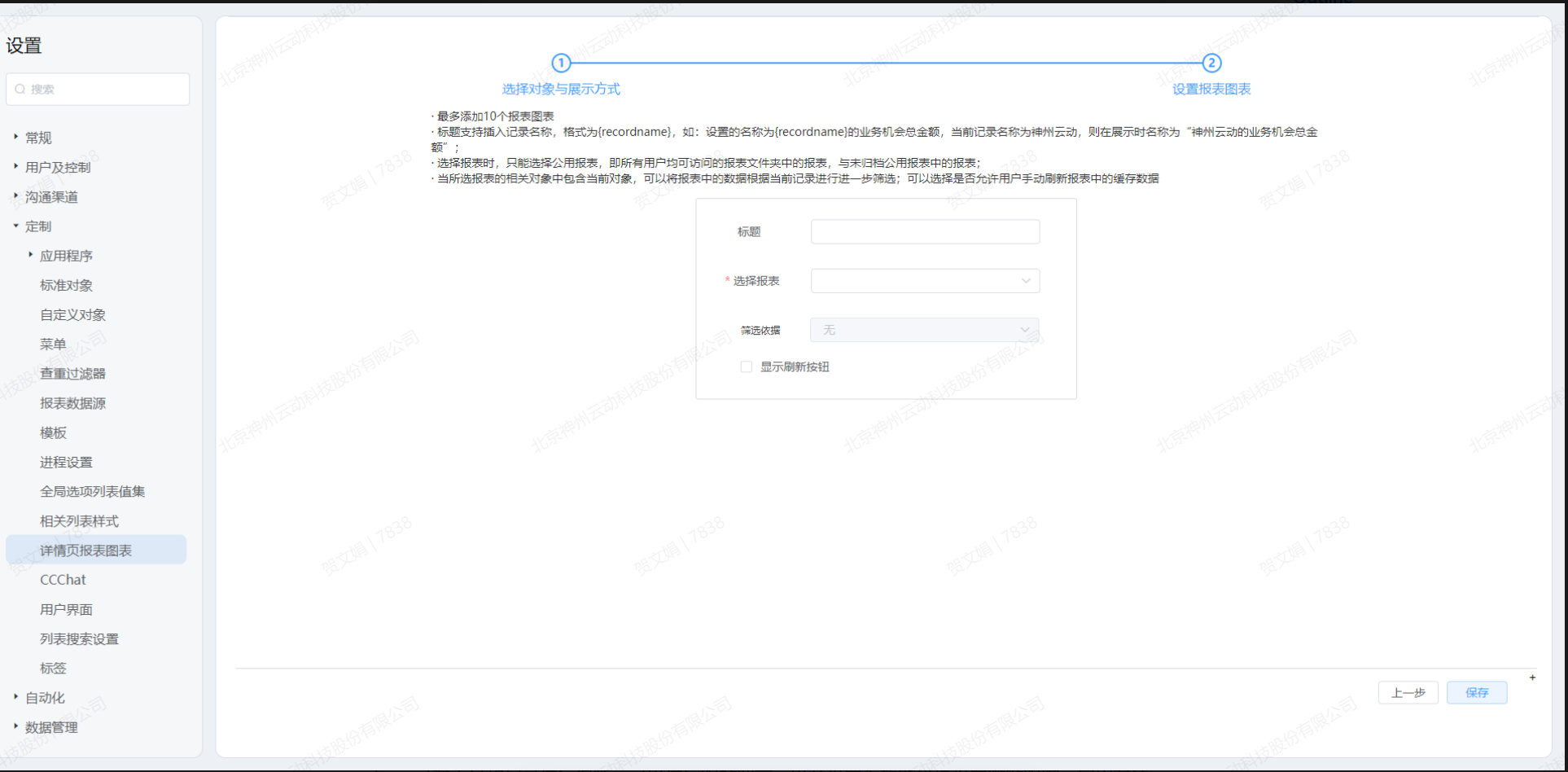 低代码定制 详情页报表图表 平台可以在记录详情页中增加图表模块,以展示对象的数据,最多支持插入10个报表图表。新建点击新建,进入详情页报表图表设定流程选定对象与记录类型,点击下一步进入设置报表图表页面。输入标题,选择报表与筛选依据,通过勾选是否开启“显示刷新按钮”,点击保存即可完成详情页报表图表的设置。 Previous Next