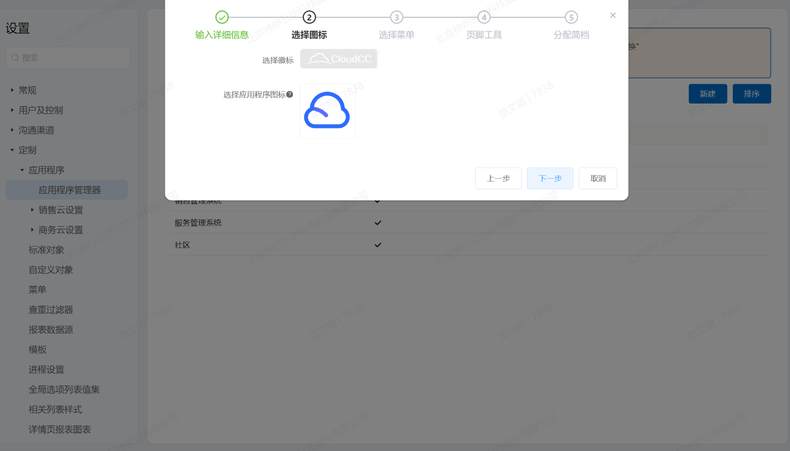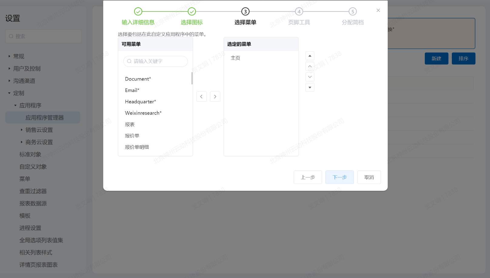 - 点击下一步进入“选择菜单”弹窗页面,选择应用程序包含的菜单。