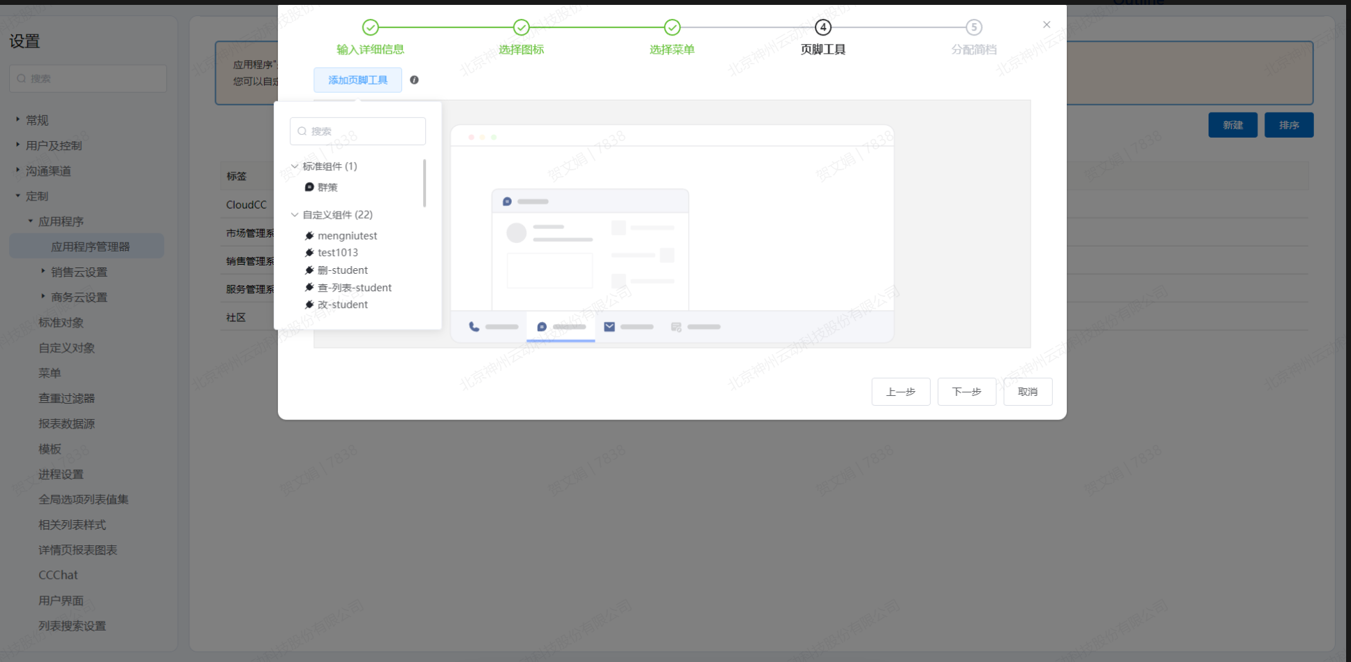 - 点击下一步,进入“页脚工具”弹窗页面,选择底部页脚要显示的工具,包括标准组件与自定义组件,自定义组件可以通过开发者平台开发。