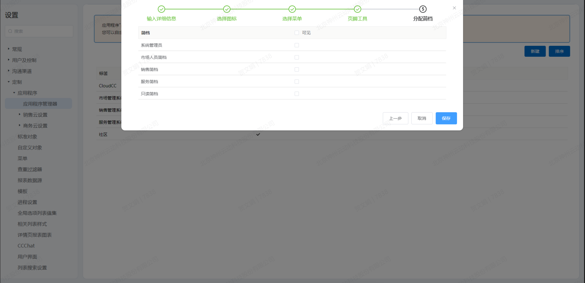- 点击下一步,进入“分配简档”弹窗页面,选择那些简档可见创建的应用程序,点击“保存”完成应用程序的创建。