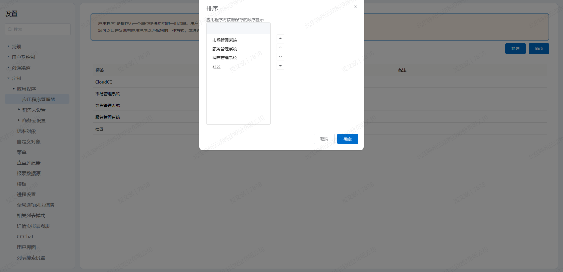 - 点击“排序”打开应用程序排序弹窗,通过拖动或点击按钮完成应用程序排序,确定之后,前台根据设定的顺序显示应用程序。