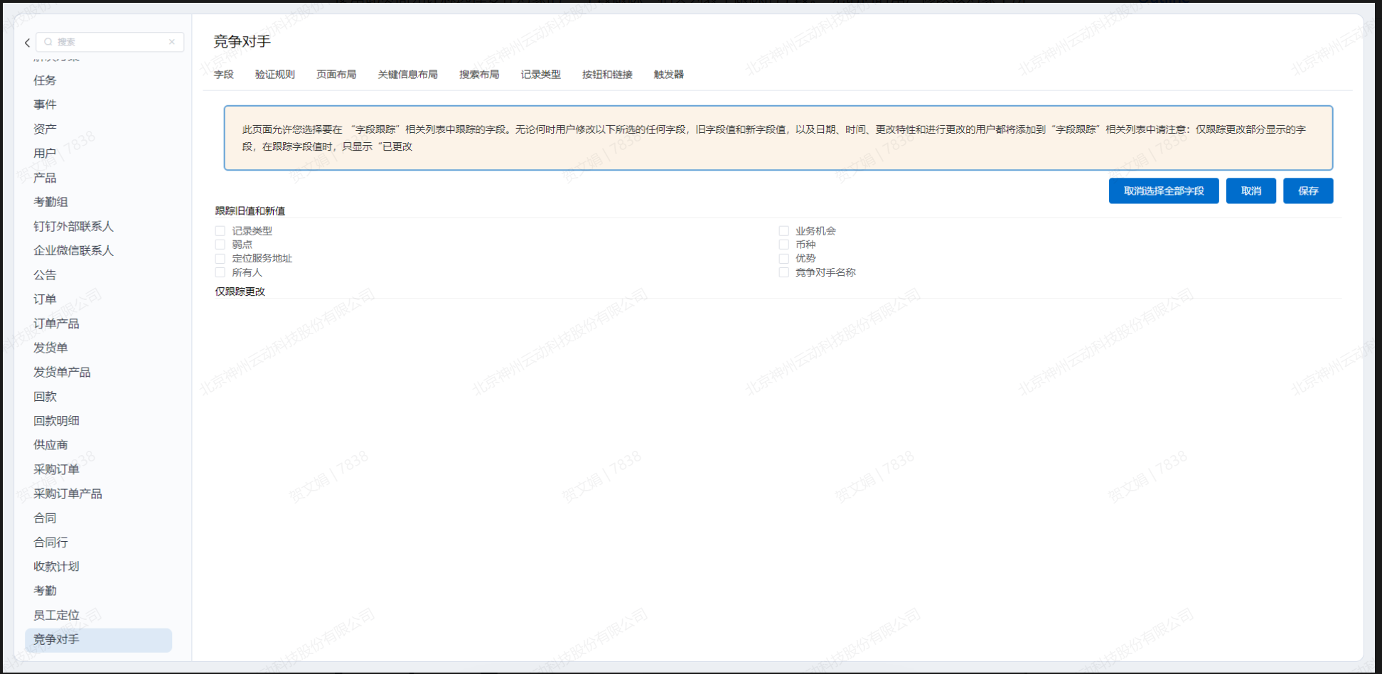 使用此页面允许您选择要在对象的 “字段跟踪”相关列表中跟踪的字段。 无论何时用户修改该对象上所选的任何字段,旧字段值和新字段值,以及日期、时间、更改特性和进行更改的用户都将添加到“字段跟踪”相关列表中。