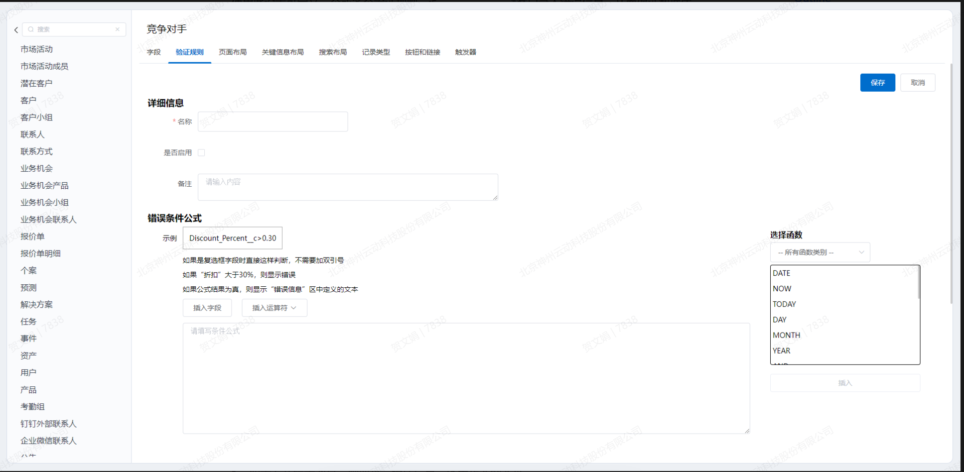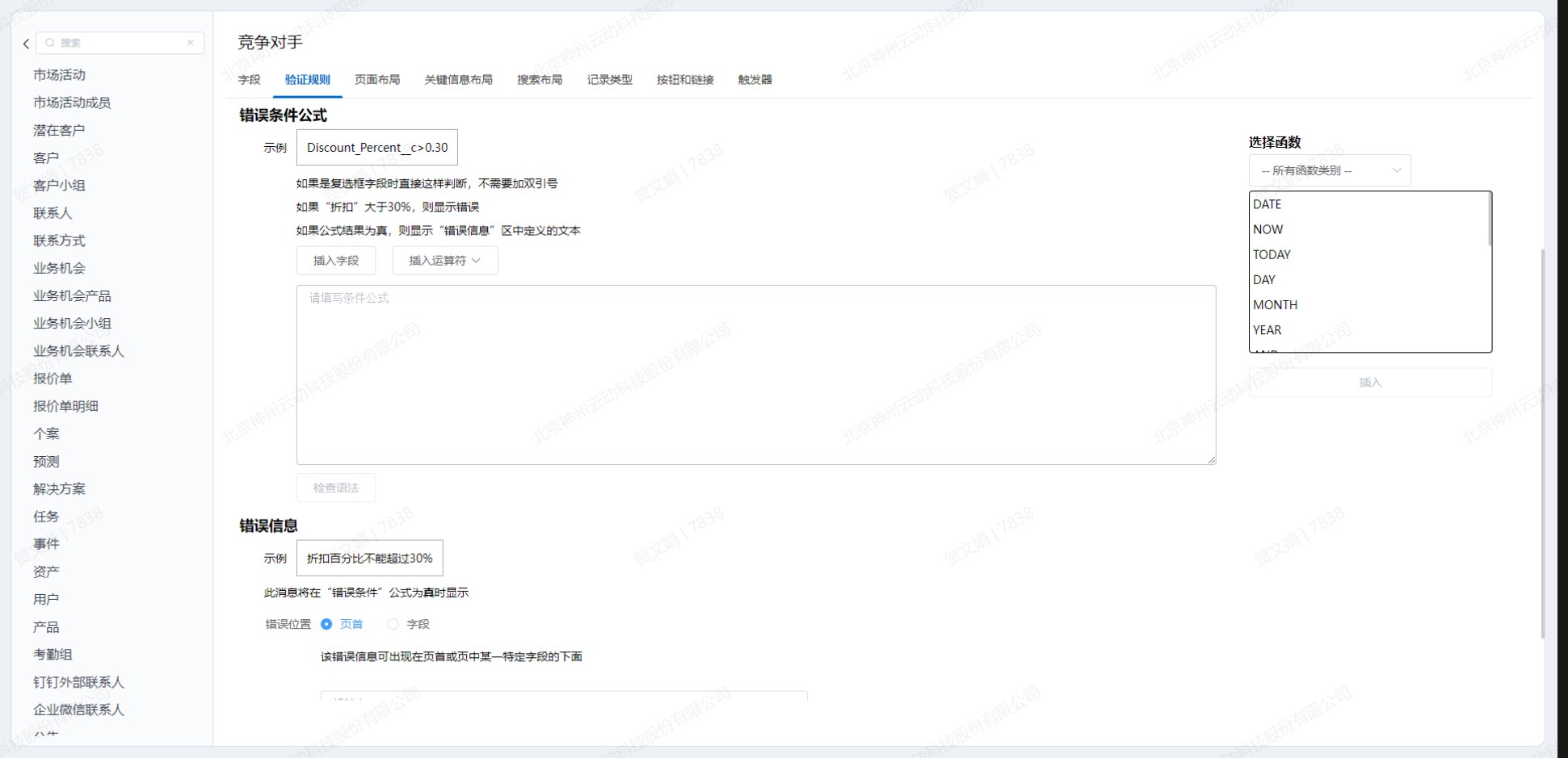 使用此设置可定义一个或多个验证规则,通过验证规则防止客户录入错误信息,从而保证数据质量。 验证规则在保存记录时执行,如果满足错误条件,则终止保存,并显示错误信息。