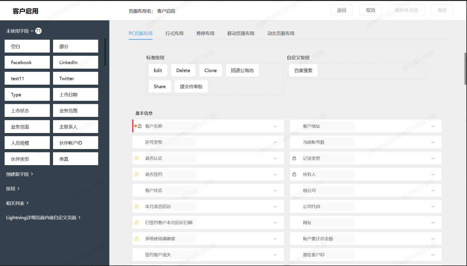 字段是用于描述对象所具有的属性。如:姓名、手机、电子邮件等。CloudCC所有对象上的字段,分为标准字段和自定义字段,CloudCC支持23种字段类型,标准字段不可删除,可编辑。