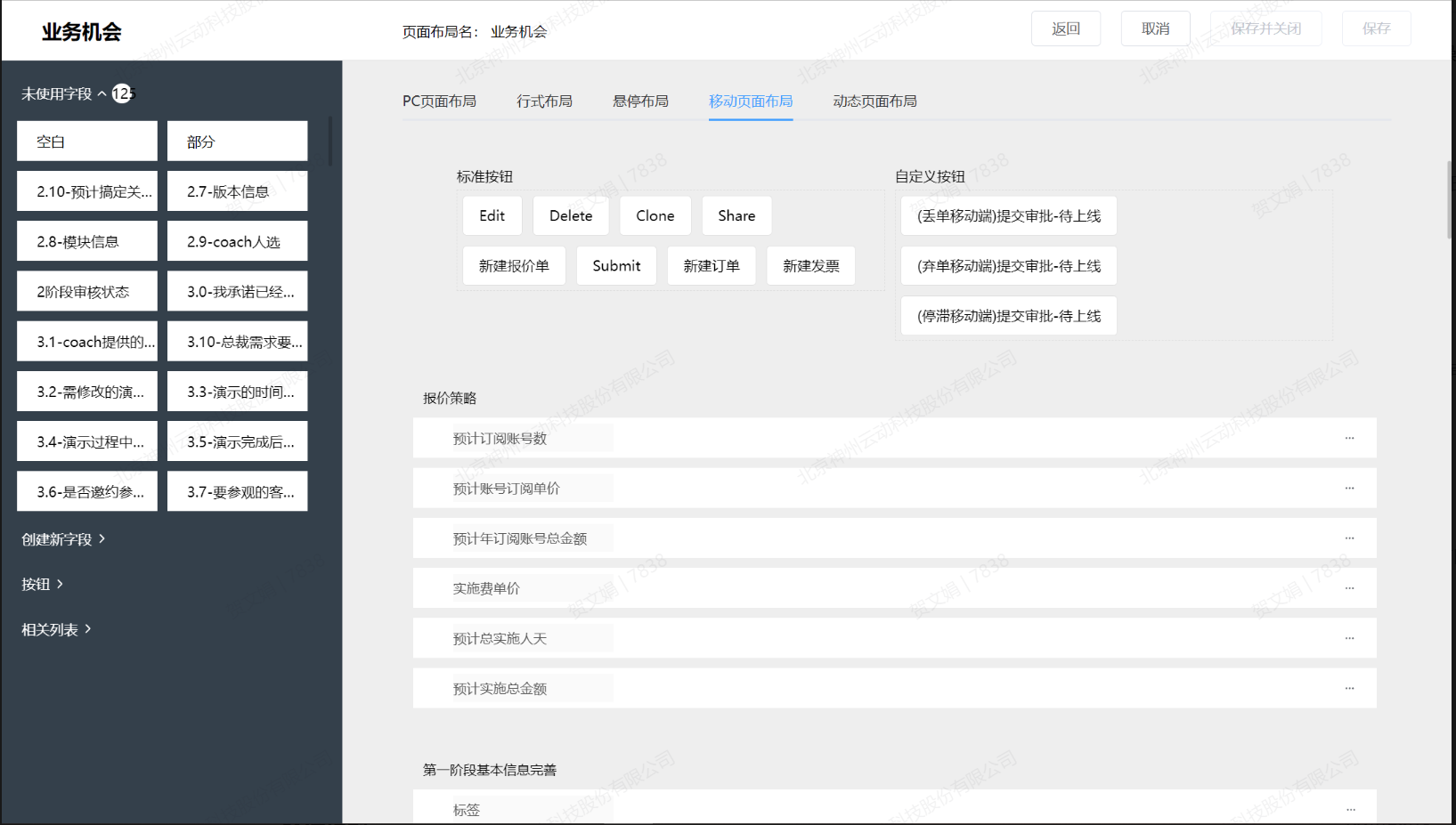| 阶段 | 组织商机的阶段,CloudCC标准分为10个阶段:1-发现机会、2-继续跟踪、3-立项、4-方案阶段、5-关键决策人搞定、6-招标、7-中标拟约、8-合同签订、9-丢标、10-弃标。销售漏斗的商机阶段依据该处设置的阶段。可根据实际组织业务流程再定制。 |