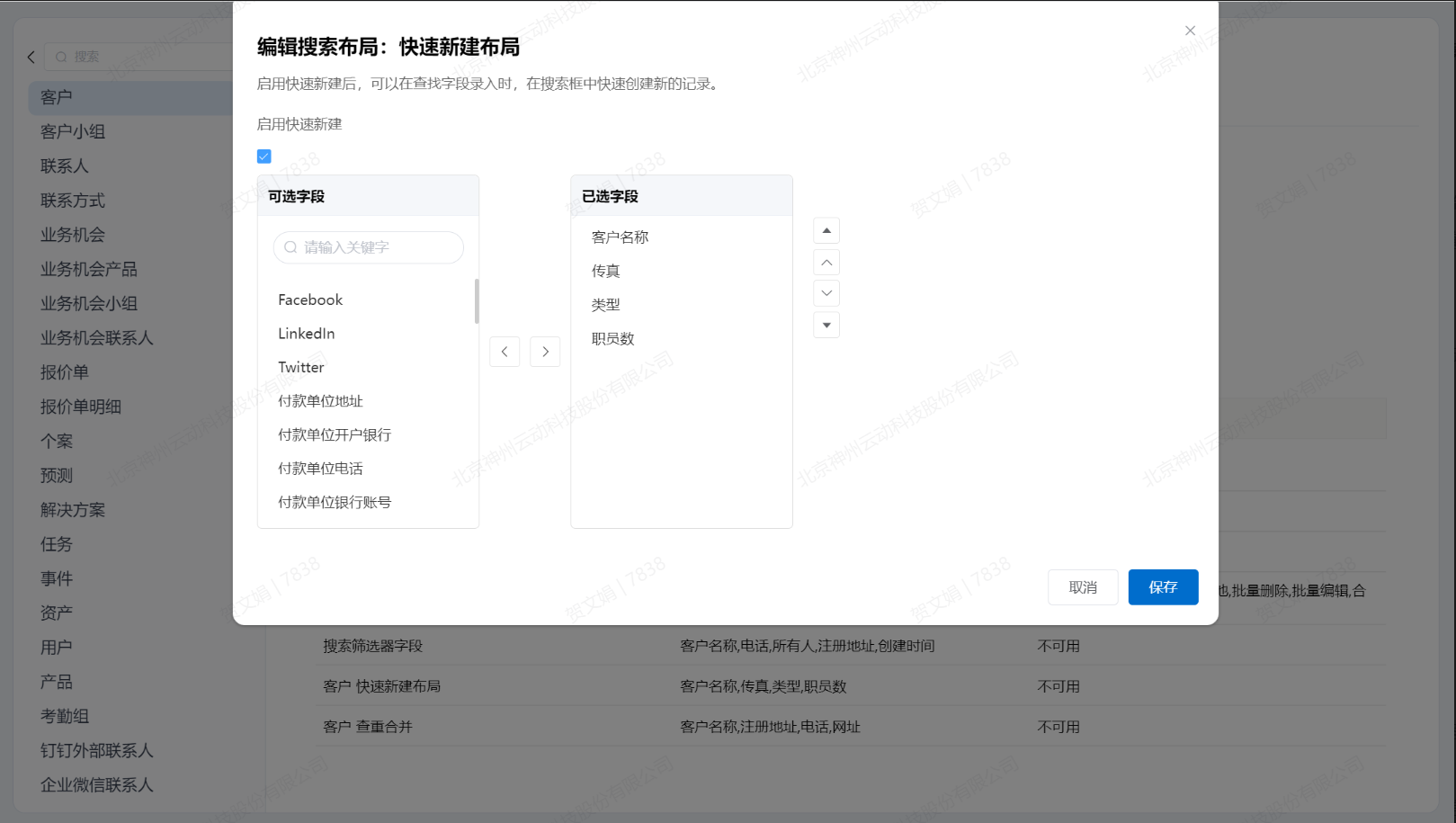 允许选择以下搜索功能中显示的标准及自定义字段: