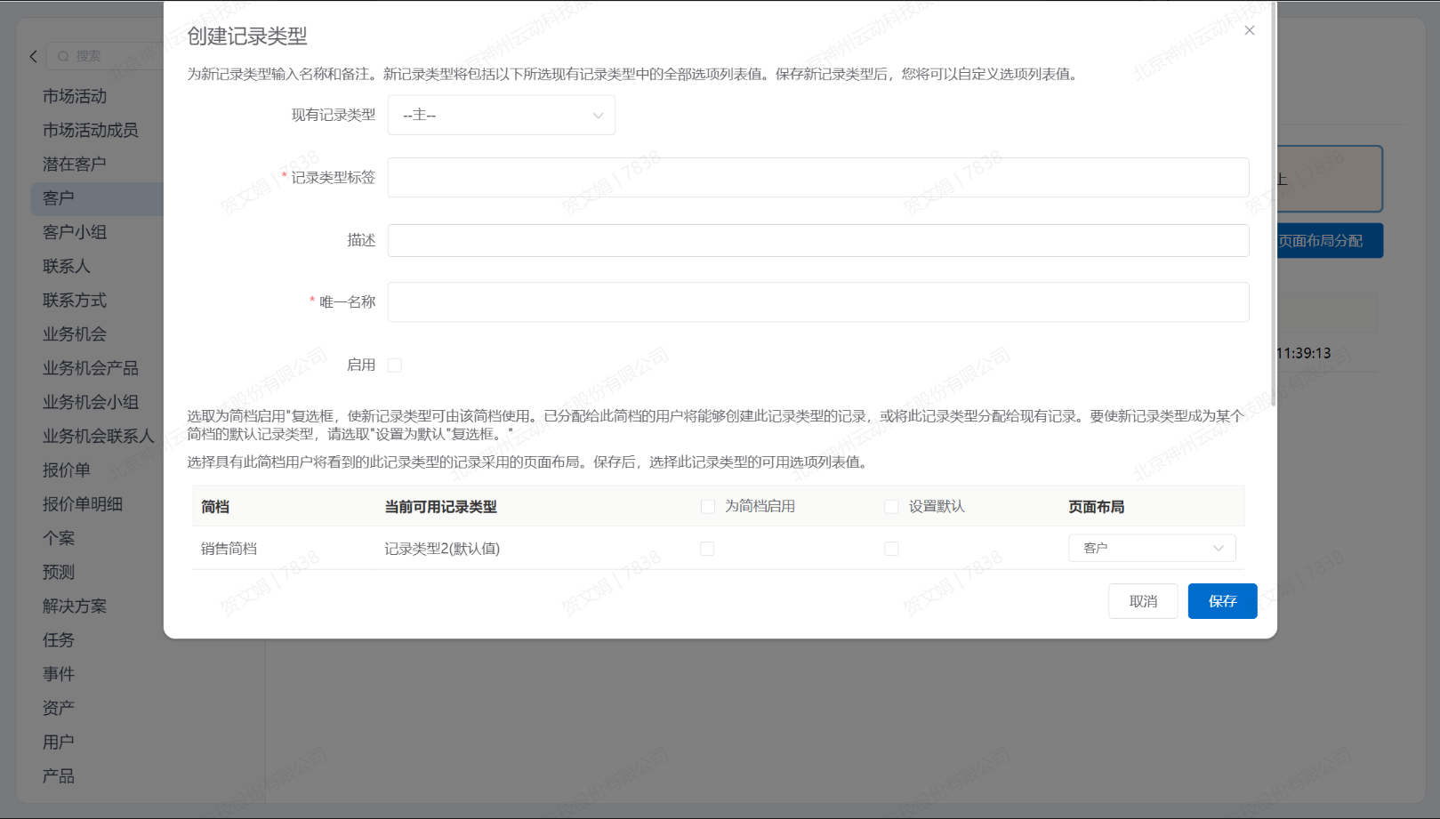 点击“新建”打开新建记录类型弹窗页面,填写记录类型的标签、描述、唯一名称,可以创建记录了类型,并分配给不同的简档。