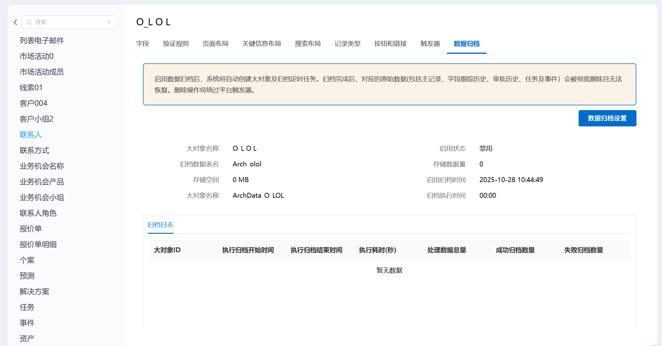 启用数据归档后,系统将自动创建大对象及归档定时任务。归档完成后,对应的原始数据(包括主记录、字段跟踪历史、审批历史、任务及事件)会被彻底删除且无法恢复。删除操作将绕过平台触发器。