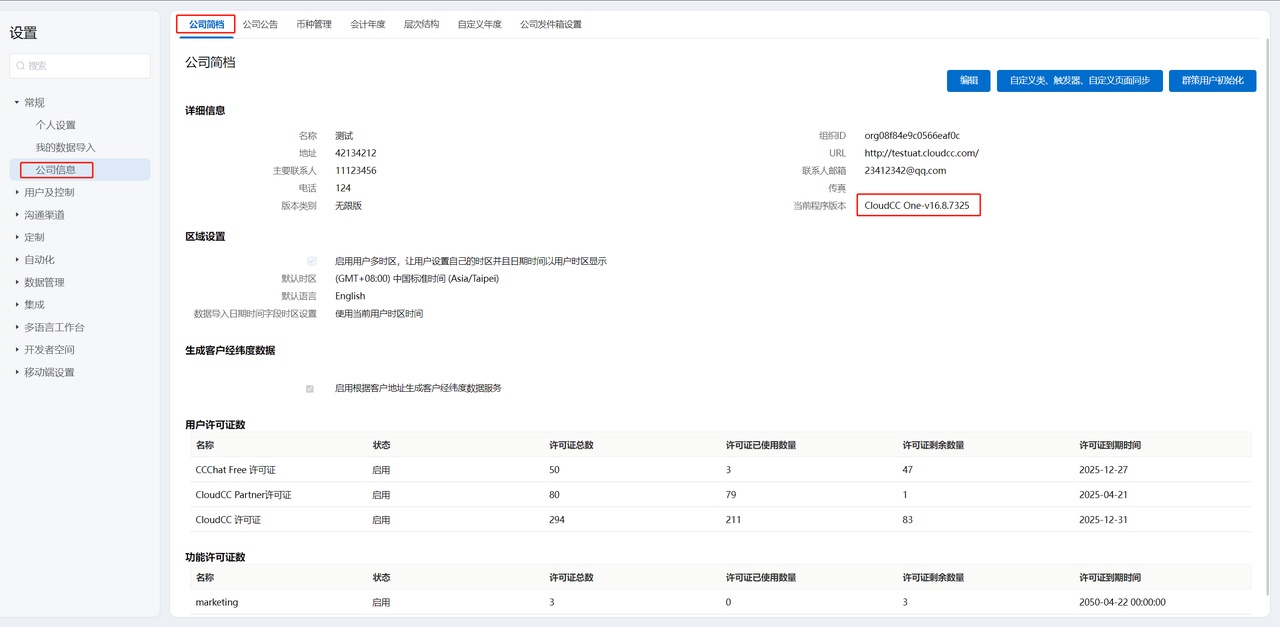 此文档适用于CloudCC One版本的OpenAPI接口。要查看当前系统版本,请登录系统web应用,进入设置-常规-公司信息,查看当前程序版本。