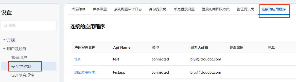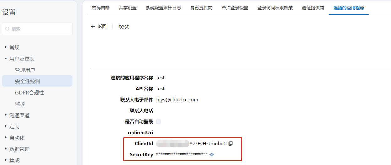 3.2.2 ClientId和SecretKey,来自于安全性控制里的“连接的应用程序”。