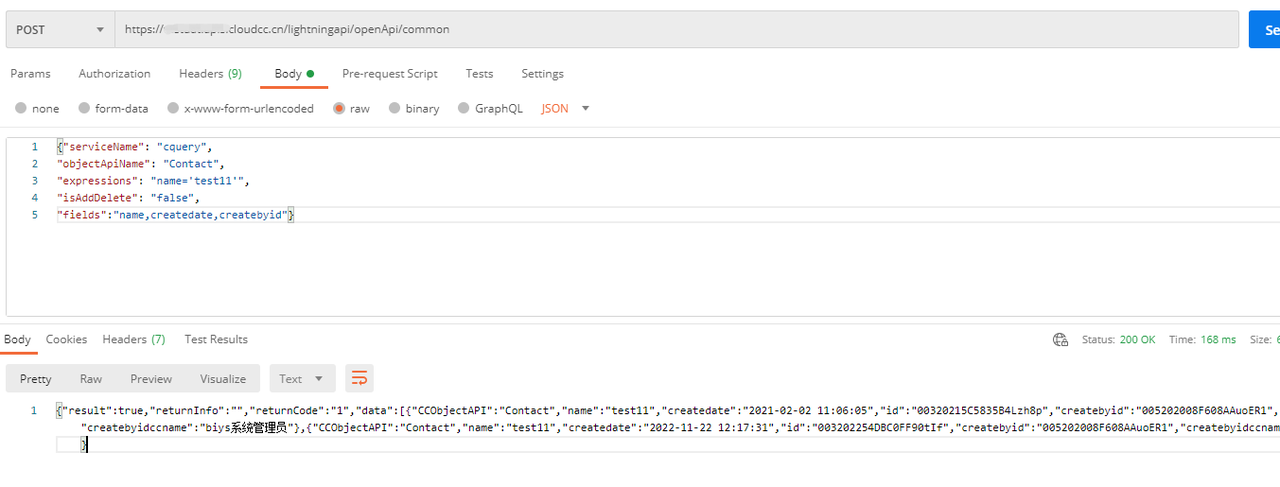 "data":[{"CCObjectAPI":"Contact","name":"test11","createdate":"2021-02-02 11:06:05","id":"00320215C5835B4Lzh8p","createbyid":"005202008F608AAuoER1","createbyidccname":"biys系统管理员"},{"CCObjectAPI":"Contact","name":"test11","createdate":"2022-11-22 12:17:31","id":"003202254DBC0FF90tIf","createbyid":"005202008F608AAuoER1","createbyidccname":"biys系统管理员"}]
