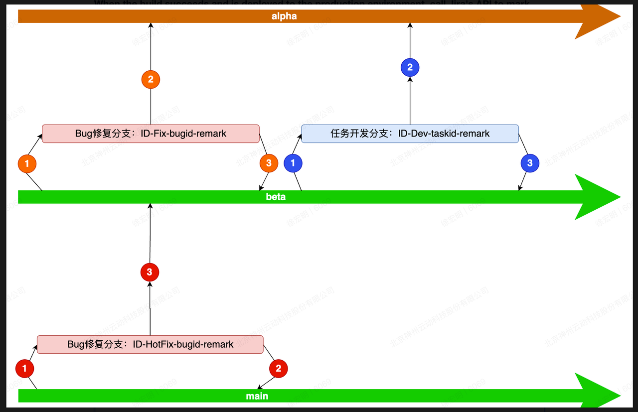 1:研发人员创建基于主分支创建修复分支2:修复完成后,申请合并到主分支,部署到生产环境3:测试人员在生产环境重新测试4:若测试失败,重复步骤2、3,直至测试通过5:测试通过后,将修复分支合并到beta、alpha分支