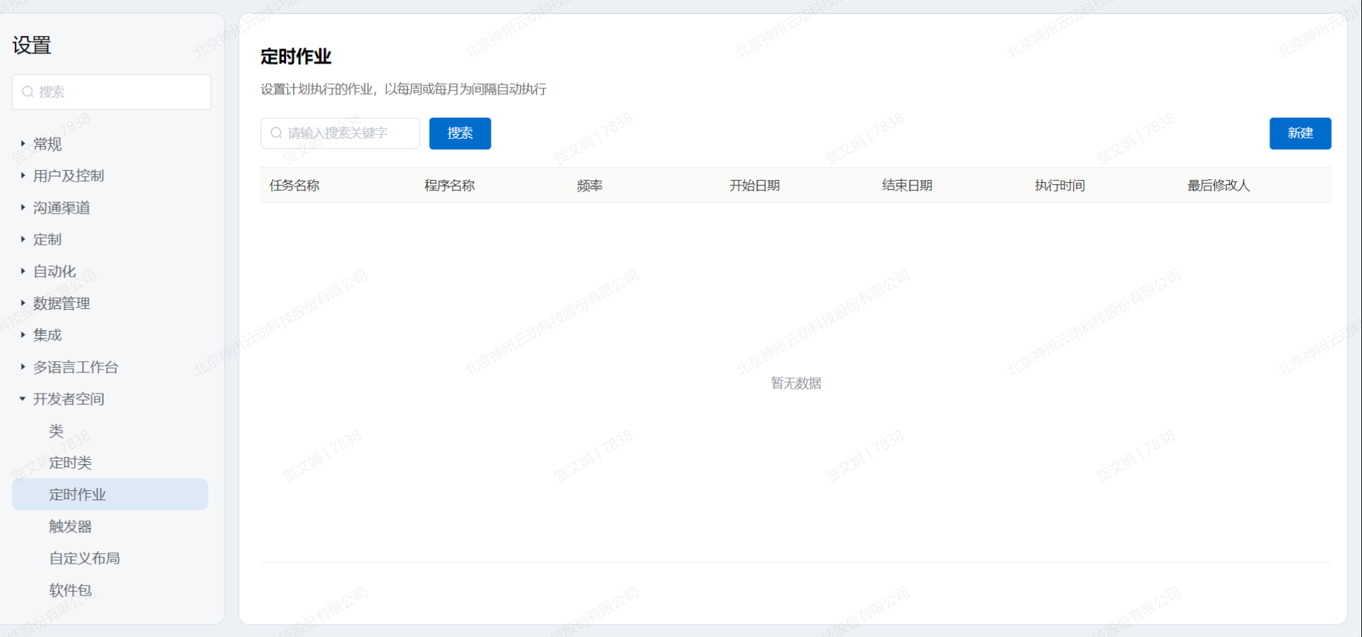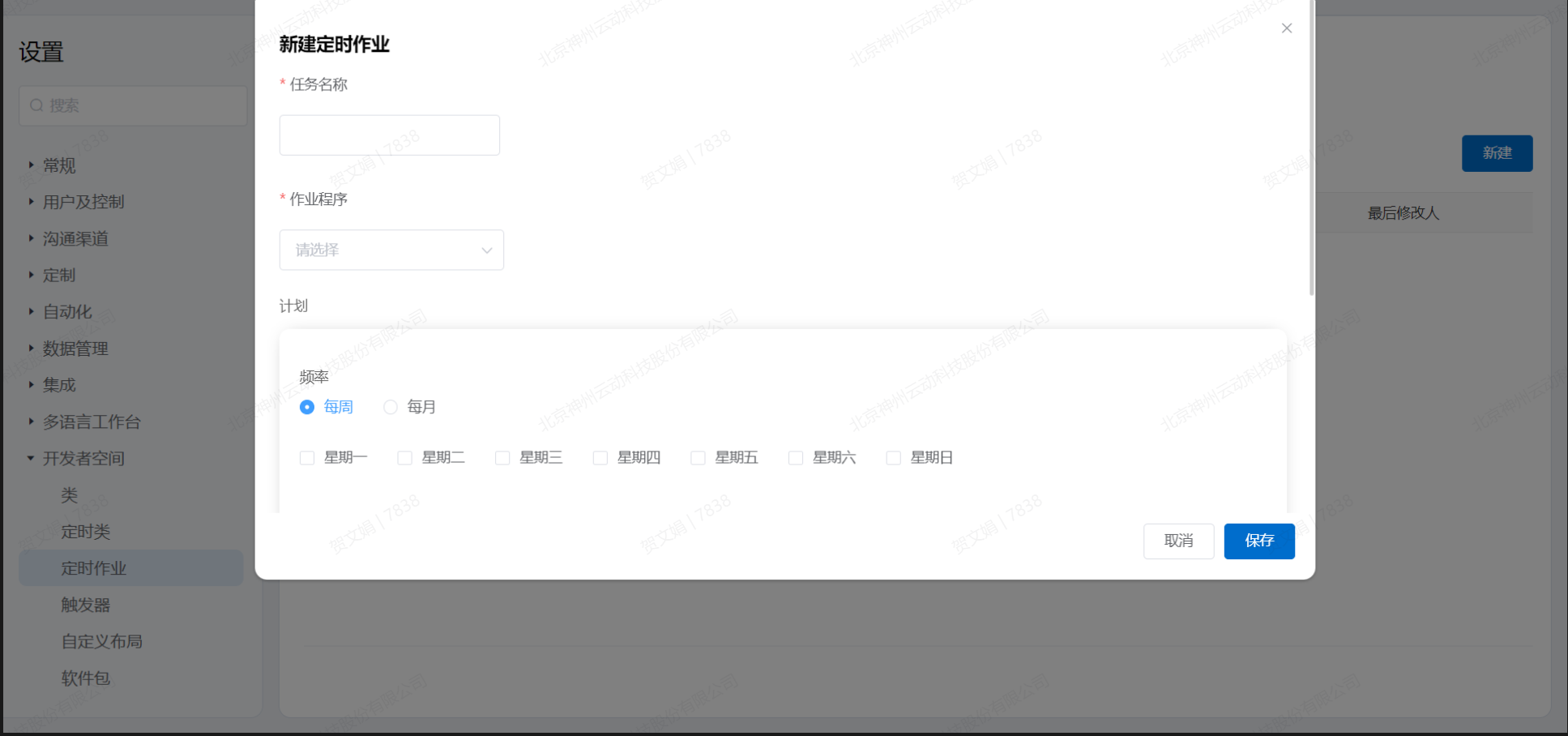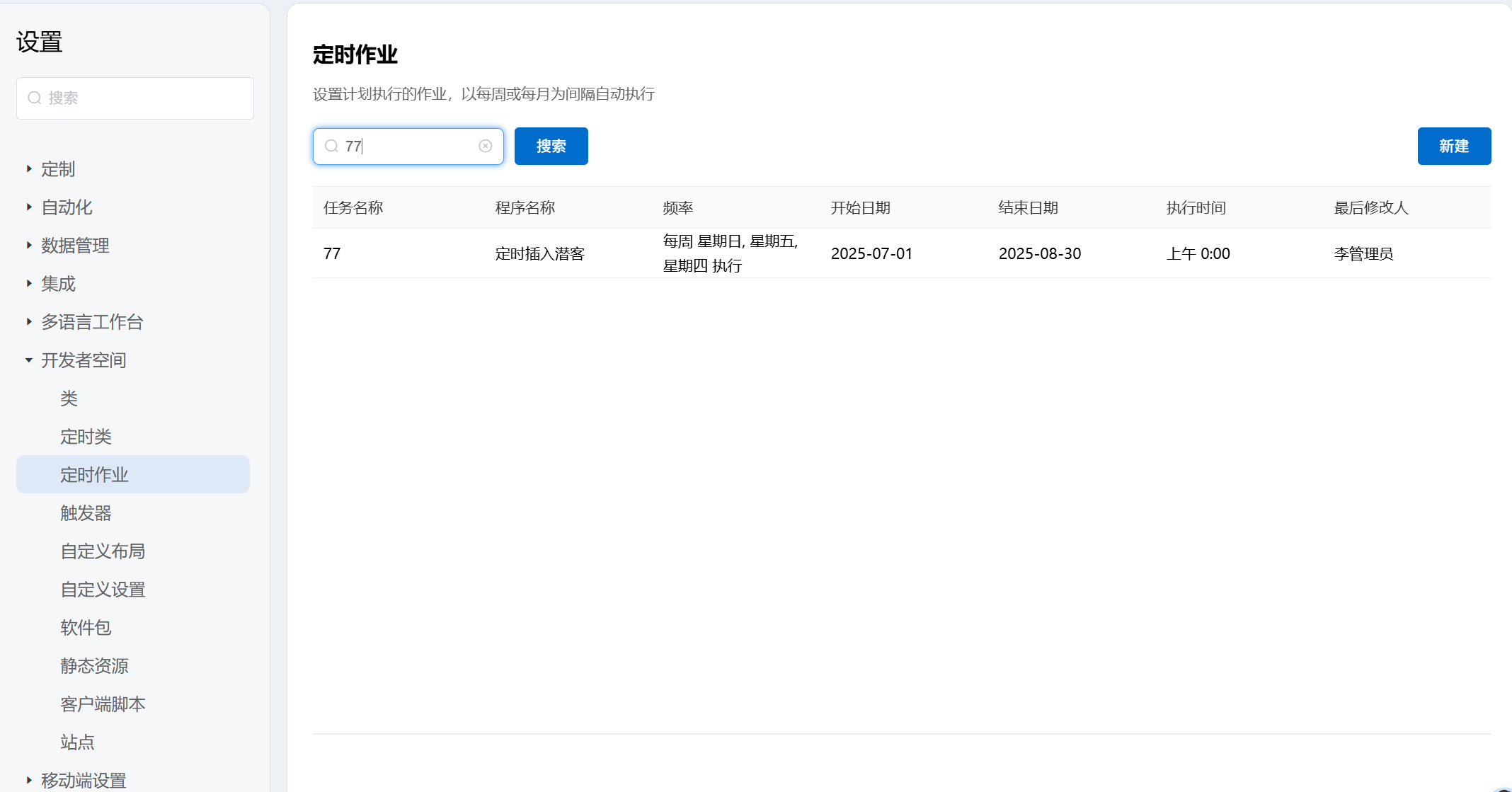 后端开发教程 定时作业 如果希望定期运行某些作业,平台允许开发人员设置计划执行的作业,定时作业以每周或每月为间隔自动执行1.新建点击新建,打开录入信息的对话框点击取消,关闭对话框点击保存,保存当前录入信息,创建定时作业任务2.搜索以任务名称为关键字,查询现有的数据,展示到表格中 Previous Next