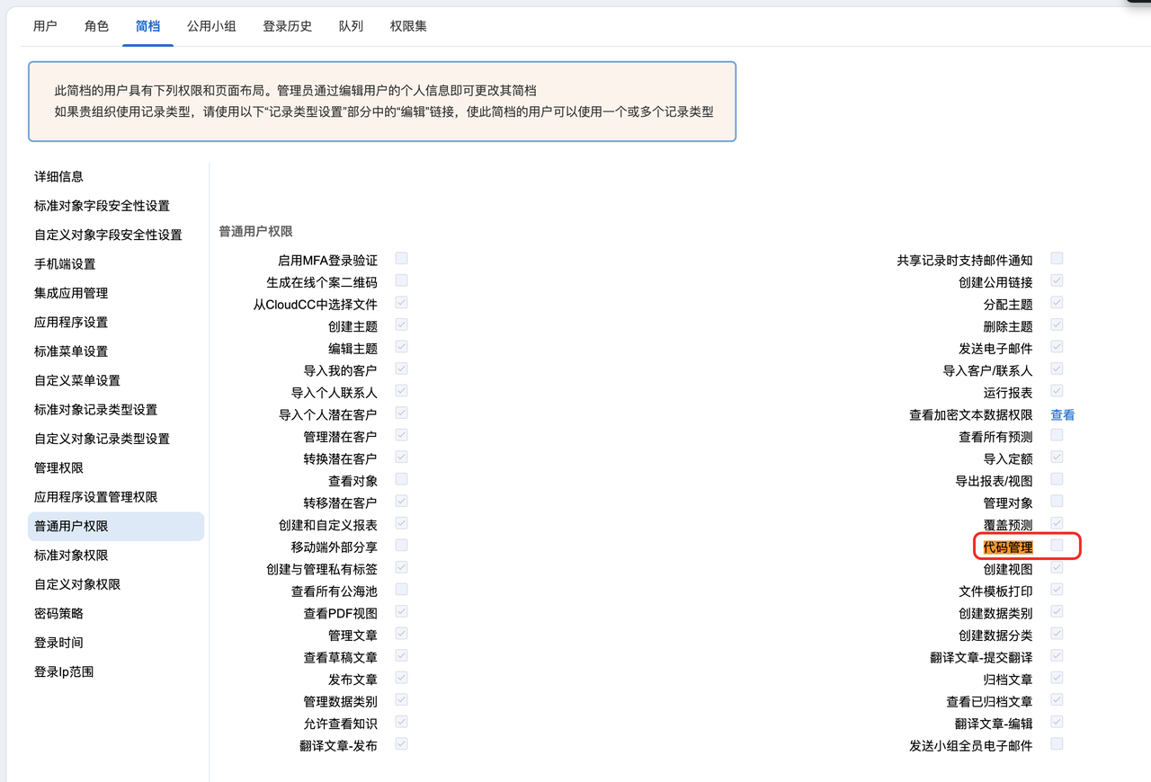 4:访问路径:管理用户——>简档——>对应的简档——>普通用户权限——>代码管理。确认此权限已经开启。