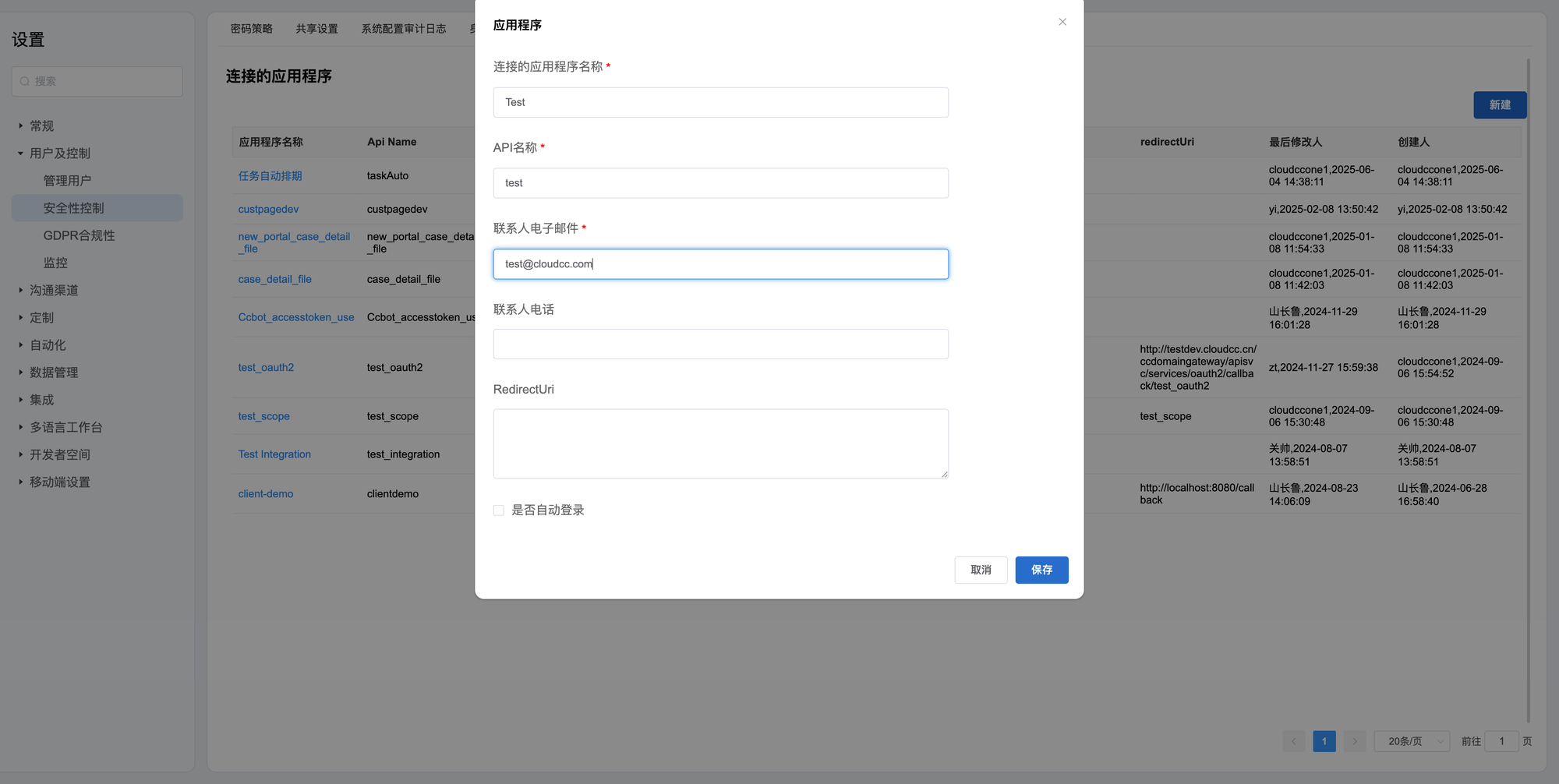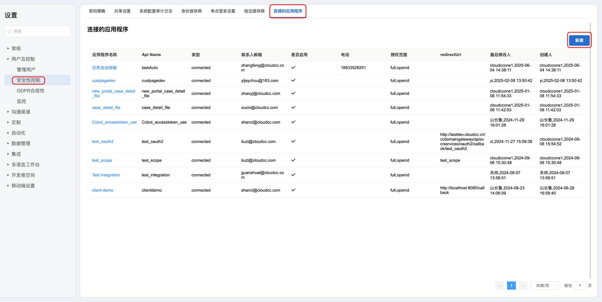 2:选择用户及控制——安全性控制——连接的应用程序——新建
