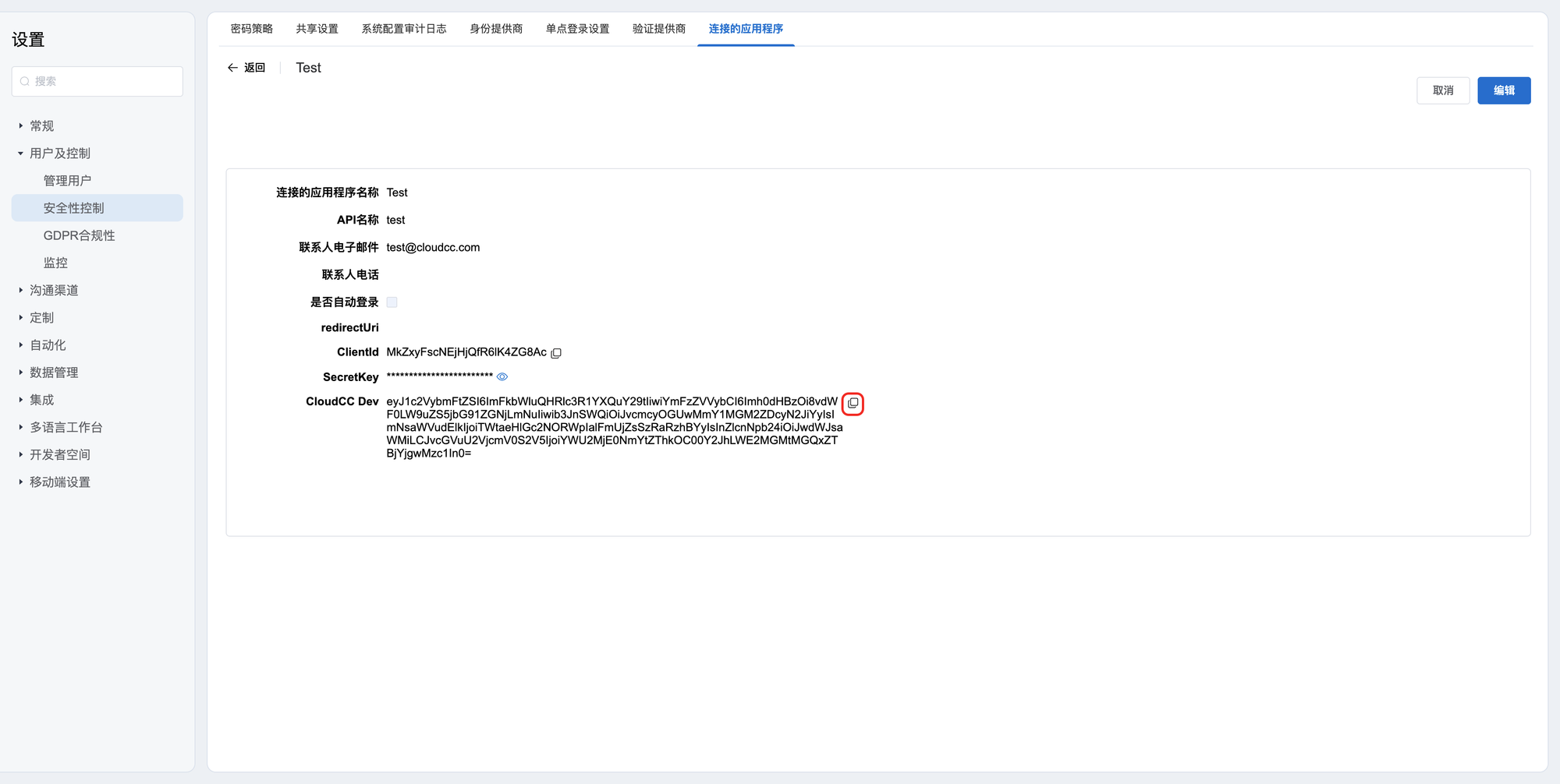 4:创建好之后,进入详情页,点击CloudCC Dev后面的复制按钮,保留备用。
