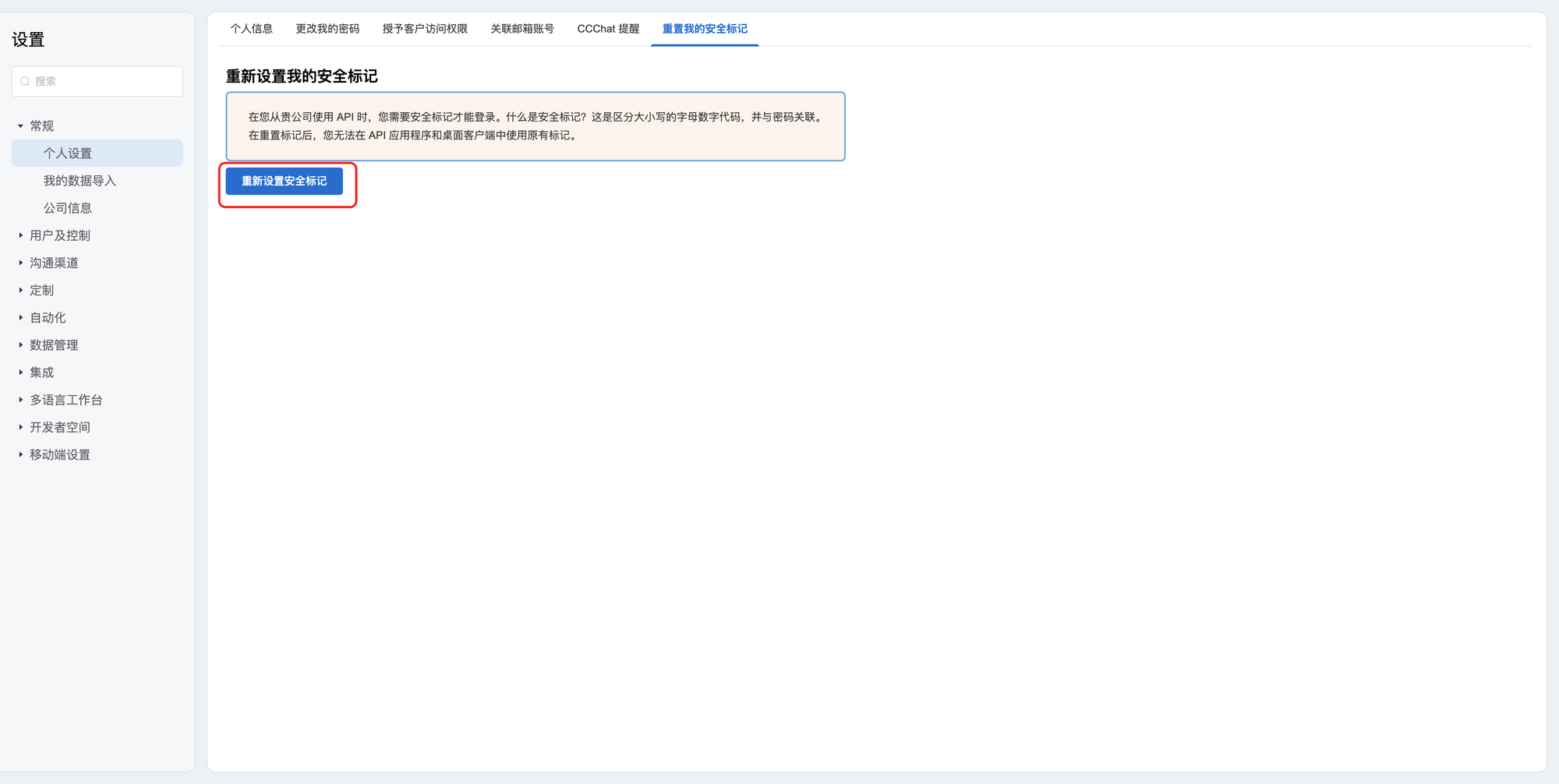 2:访问 常规 → 个人设置 → 重置我的安全标记。点击后,安全标记将发送到个人信息中所配置的邮箱。。