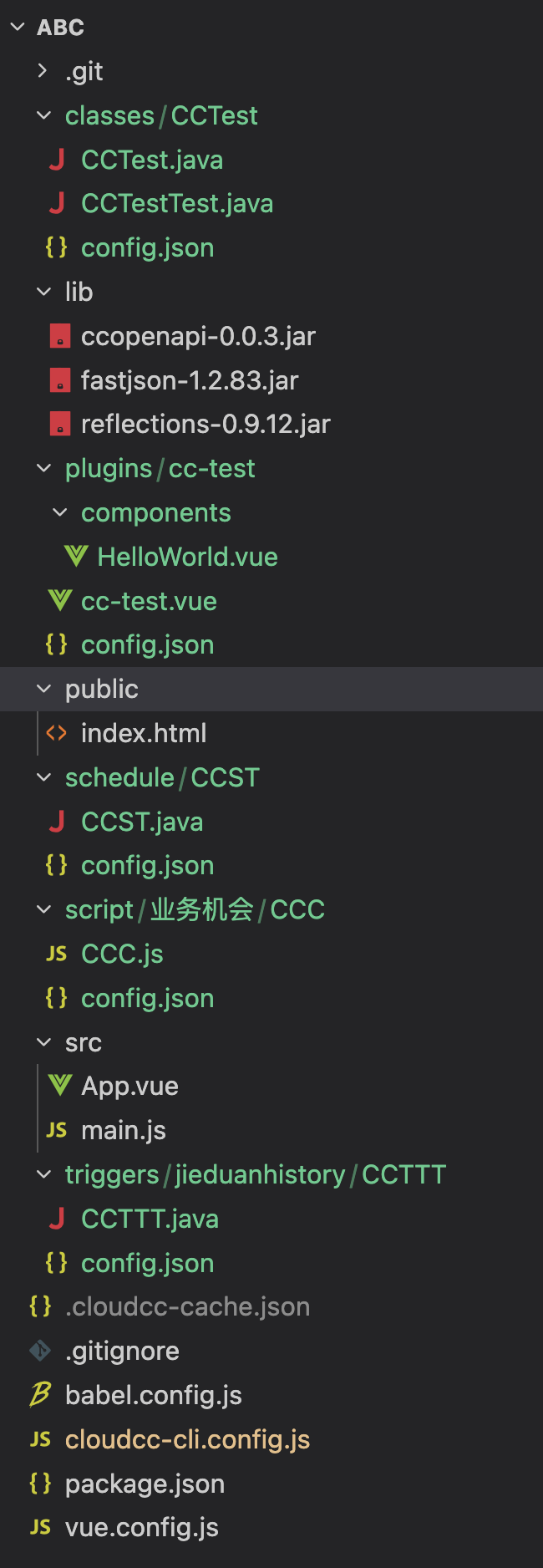 - ABC:项目名称。开发工具必须直接打开项目目录,不能嵌套多层文件夹,否则无法正常使用cloudcc-cli工具