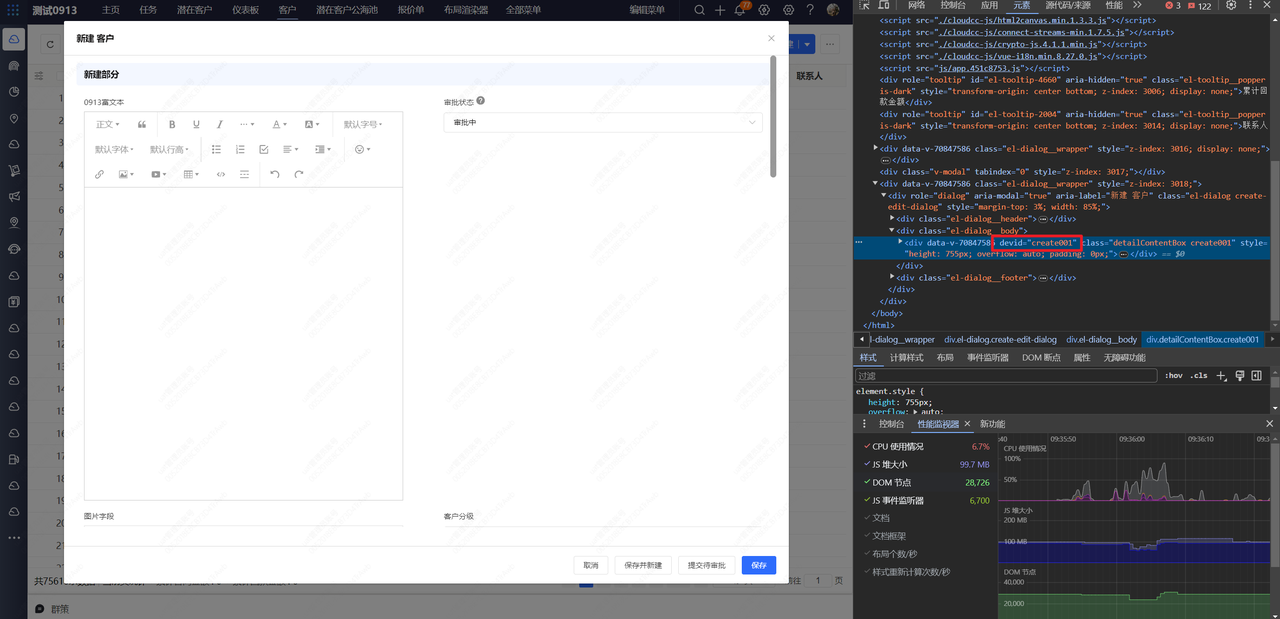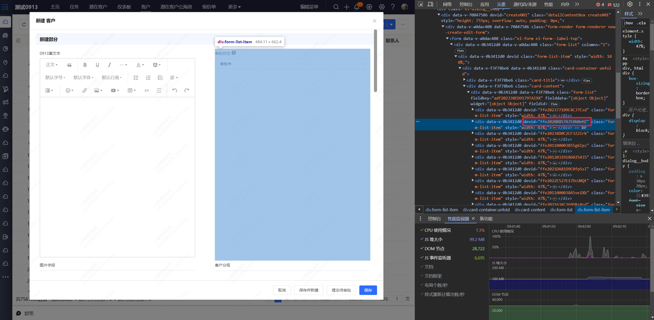 为方便开发者查找和控制页面 DOM,我们在平台的关键 DOM 上添加了devid自定义属性。通过此属性,开发者可以快速查找不同业务页面,如新建页、编辑页、详情页,也可以查找对象字段 DOM。官方对devid做兼容处理,保证可用,如果使用其他dom查找器,平台无法保证兼容性。
