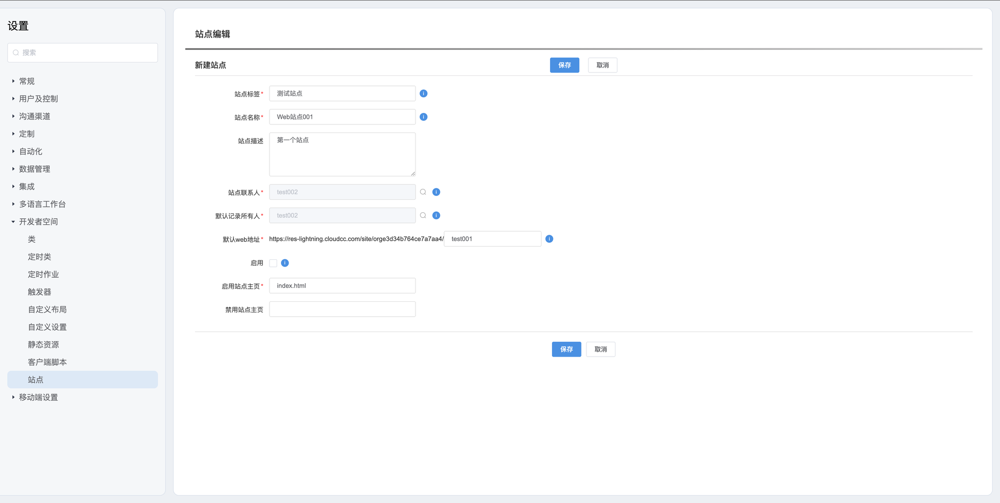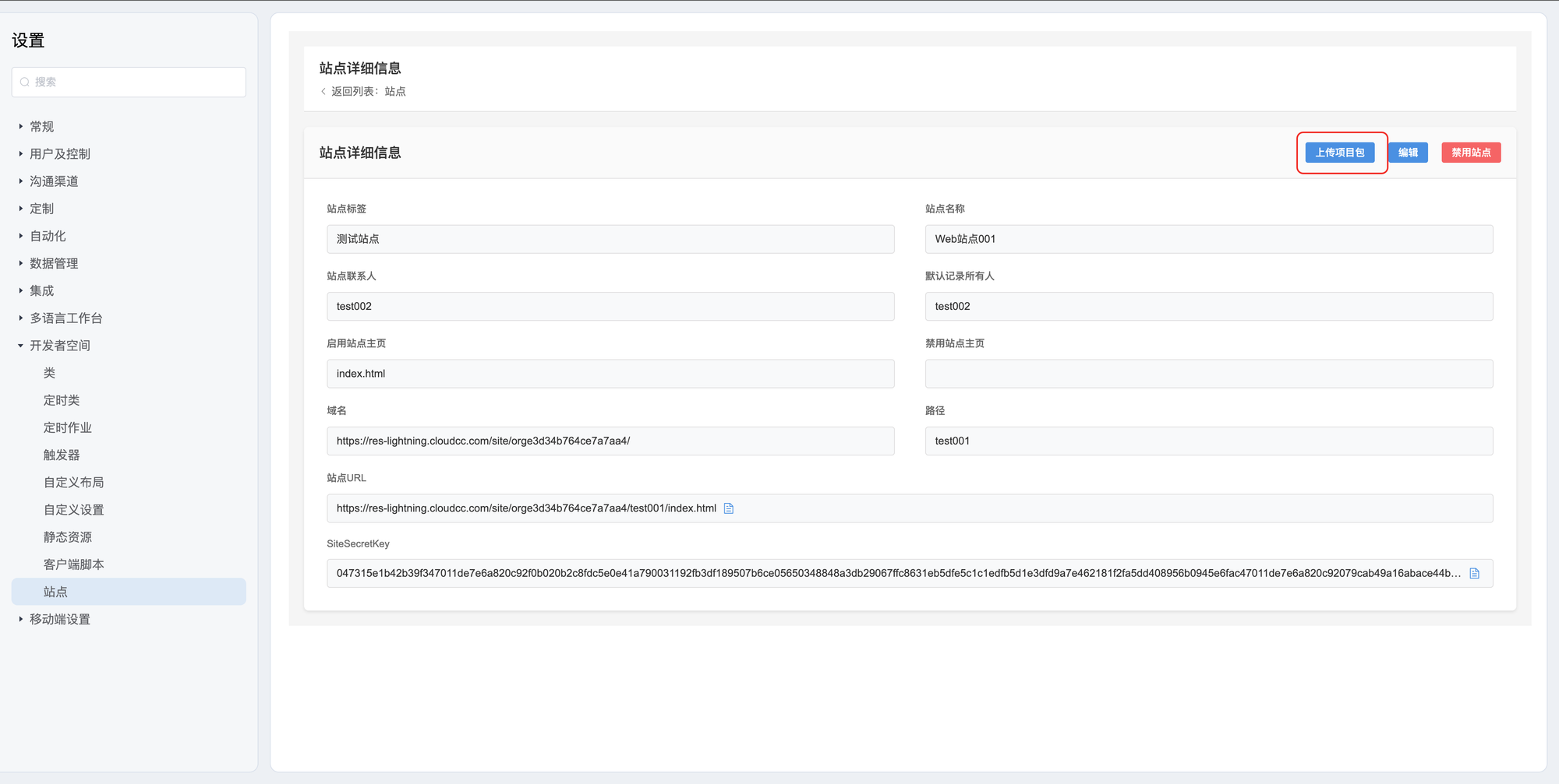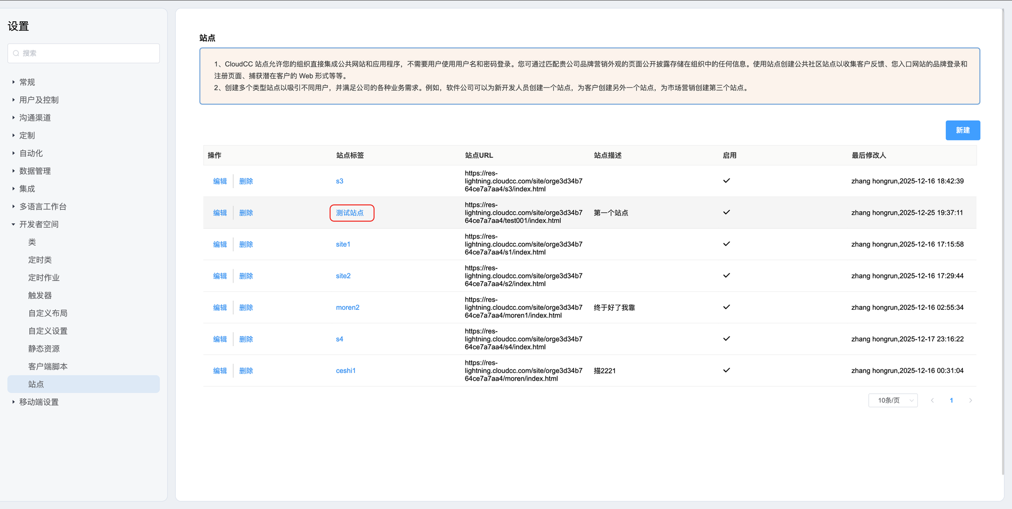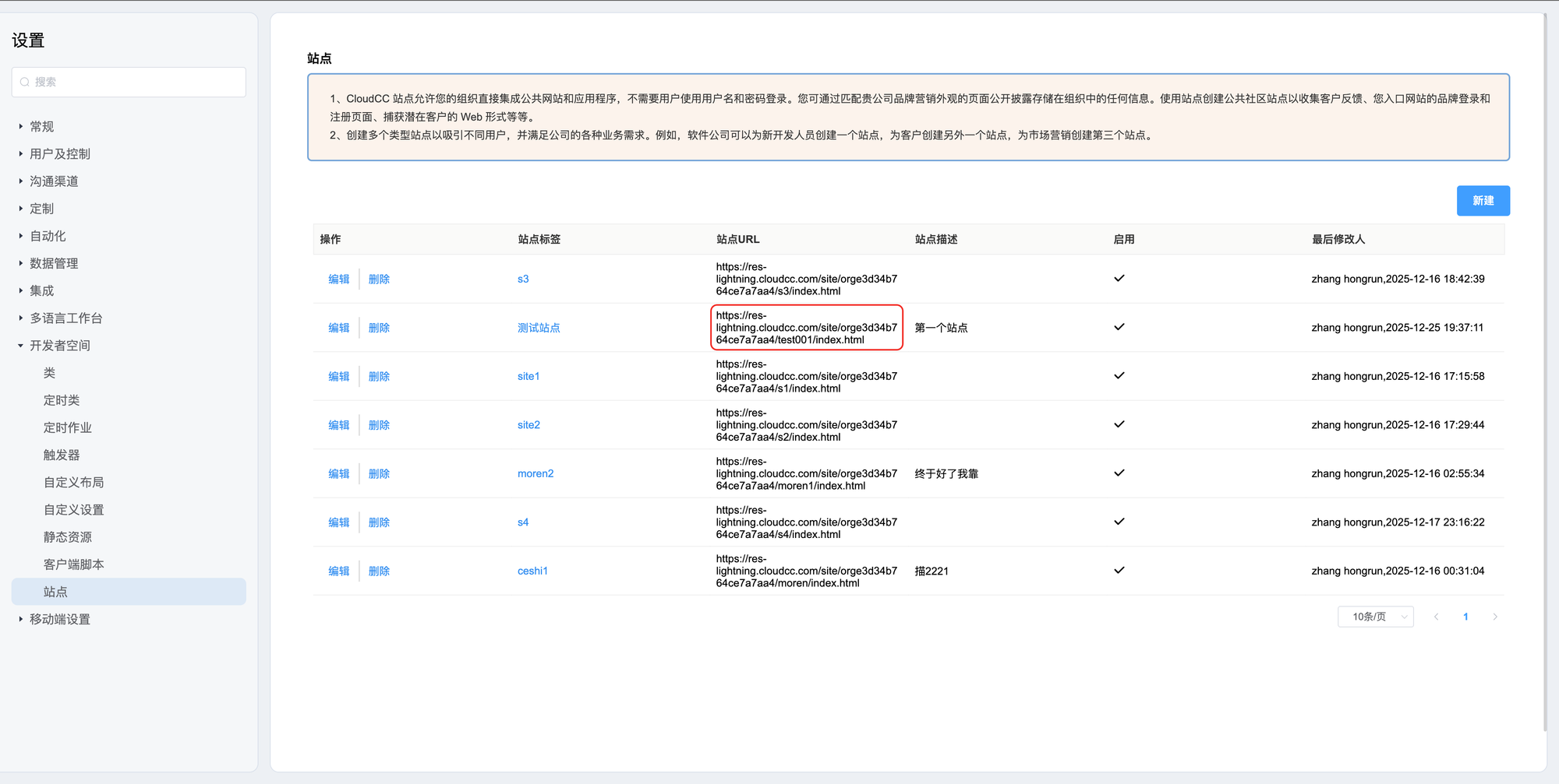 登录CRM系统,访问后台设置——》开发者空间——》站点,点击右侧新建