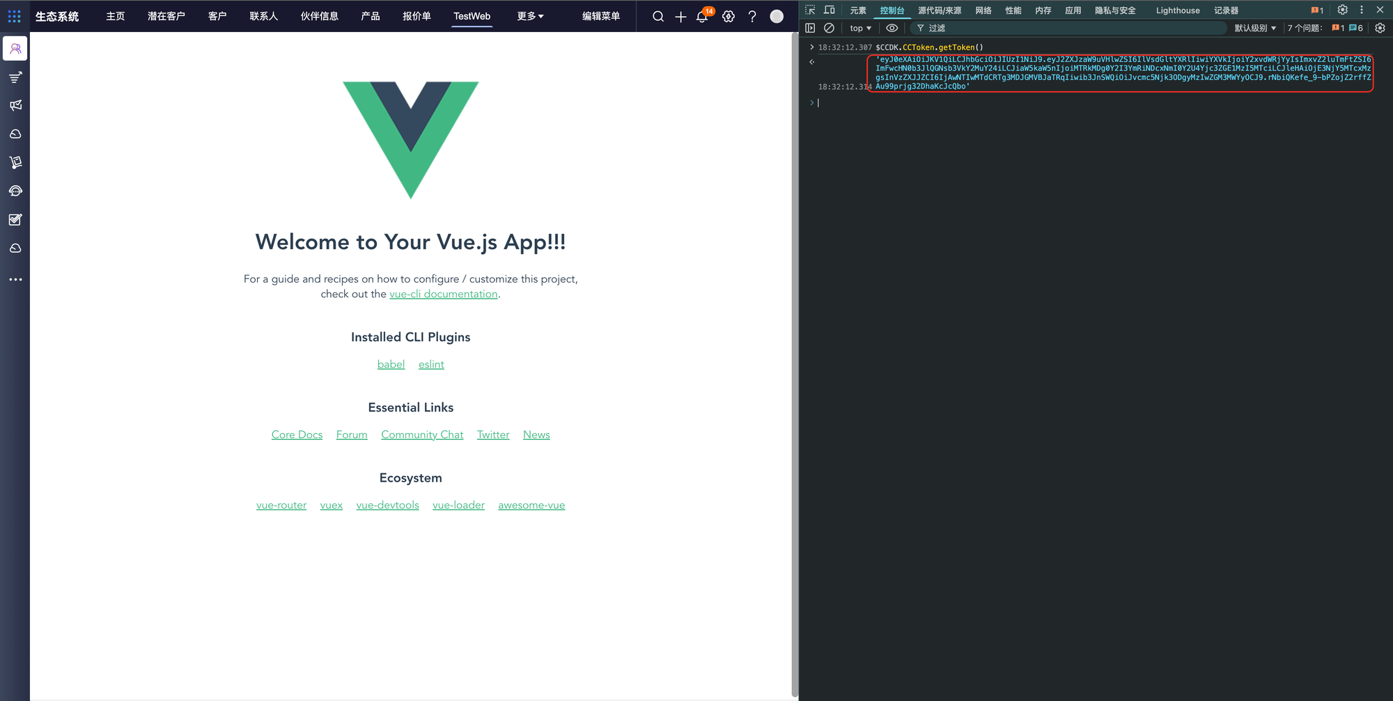 # 访问CRM系统,打开页面控制台,输入以下代码获取token。token具有实效性,提示无效时需要重新获取。