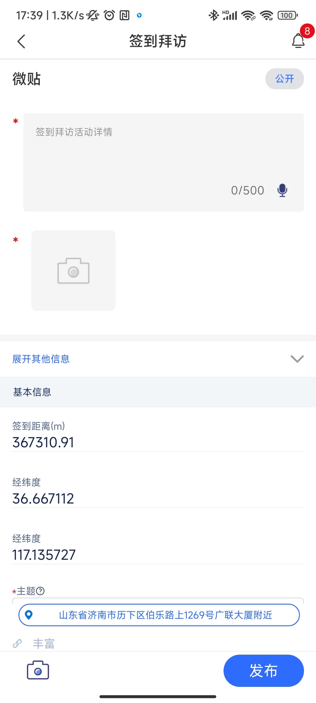 3.微帖页经纬度字段(所在地点)只读,在微贴中输入本次活动的主要事项,点击下方发布即可完成一次拜访签到事件