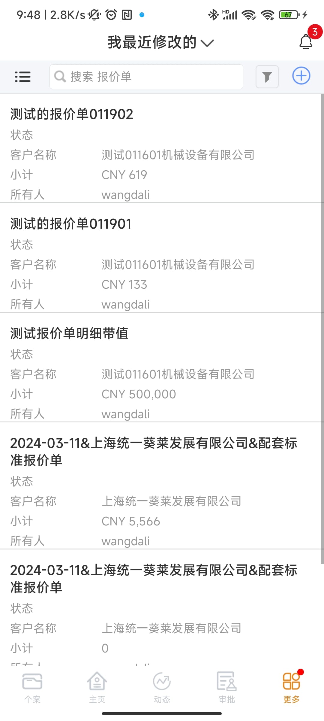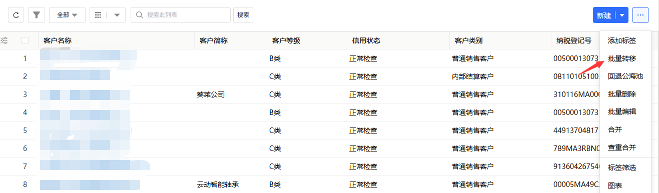 ⑤:列表,用于展示用户权限内的数据,标蓝项可跳转对应详情页,每一行数据序号前三个点有编辑、删除、更改所有人的快速操作