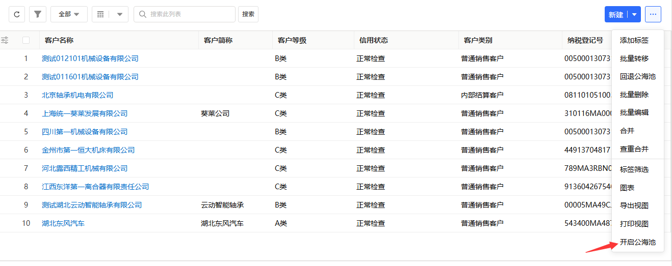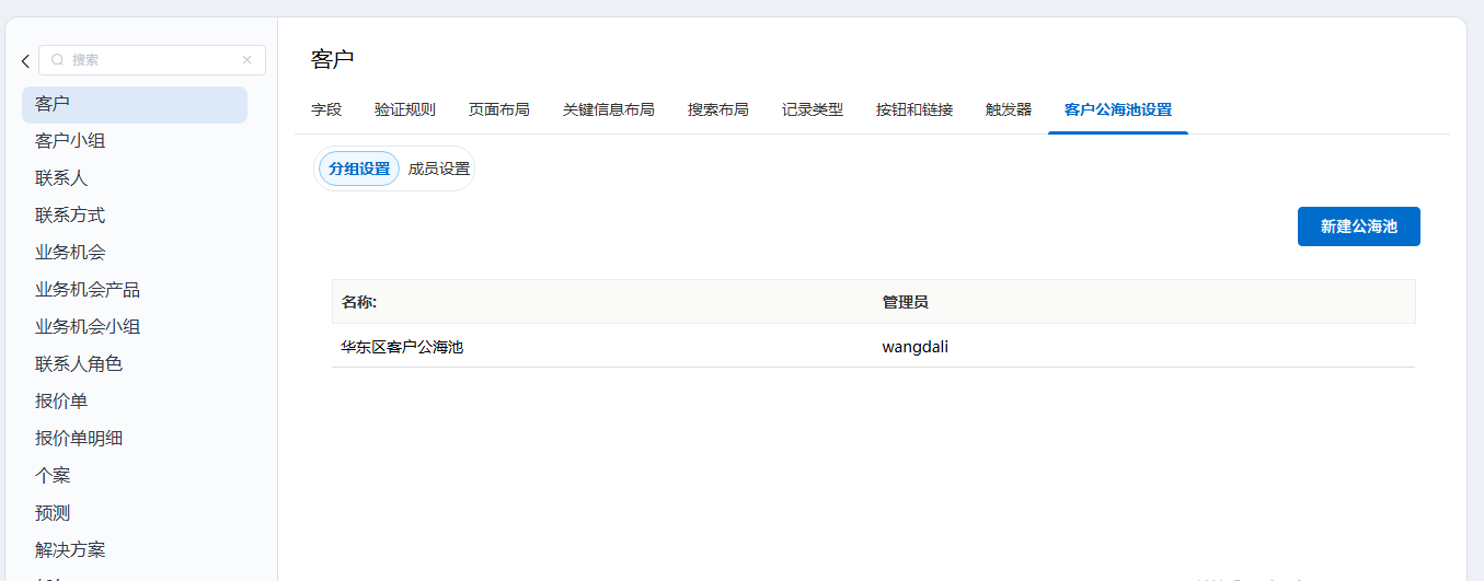 - 创建公海池:在公海池列表页面,点击「新建公海池」按钮。