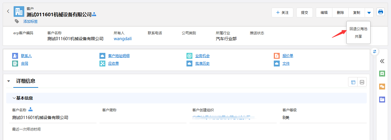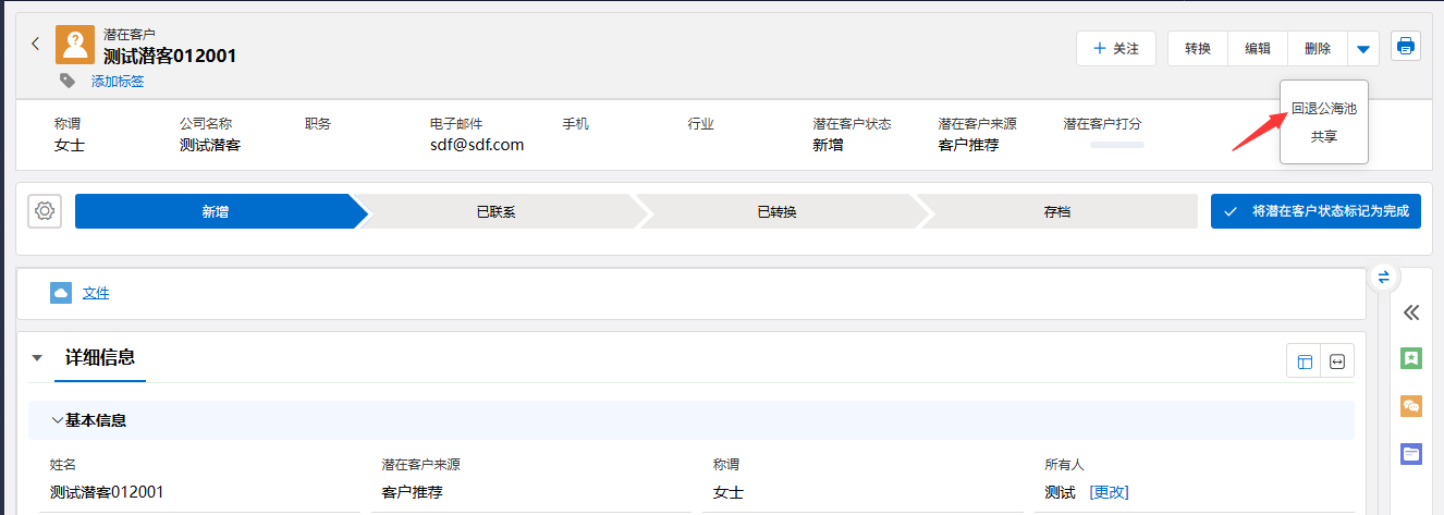 - 在详情页面的右上角区域,找到并点击「回退公海池」按钮。
