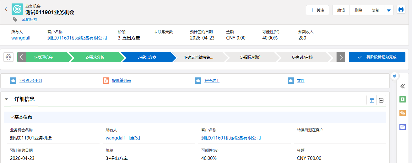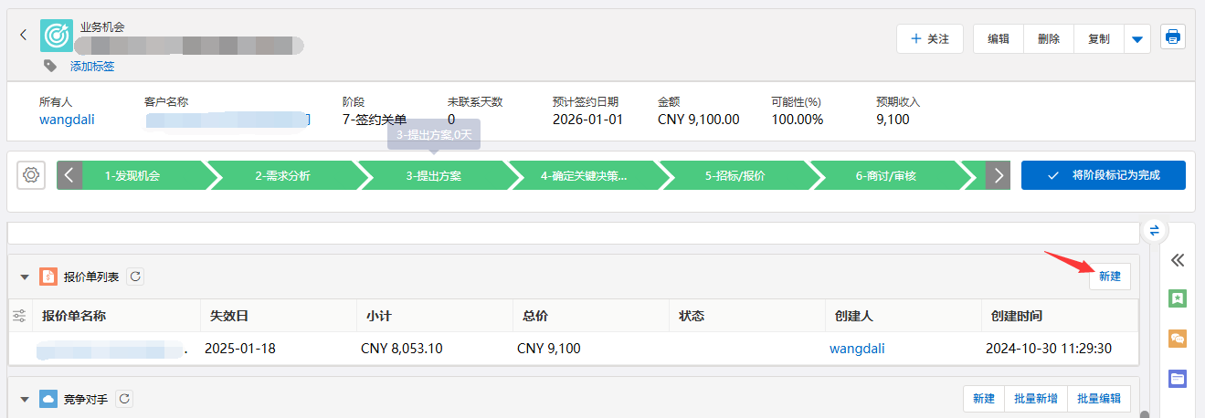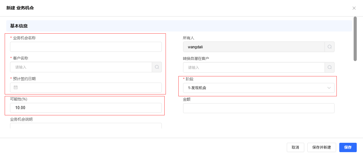 - 如需创建新业务机会:勾选“创建业务机会”选项,并填写业务机会名称、预计金额、截止日期等关键信息。