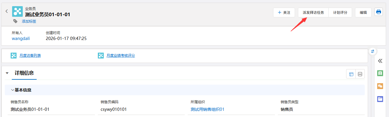 - 在详情页右上角的功能区,找到并点击 「派发拜访任务」 按钮。