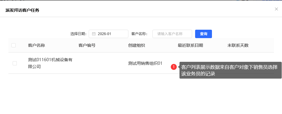 - 在弹出的任务派发窗口中,系统将自动列出该业务员名下负责的所有客户。