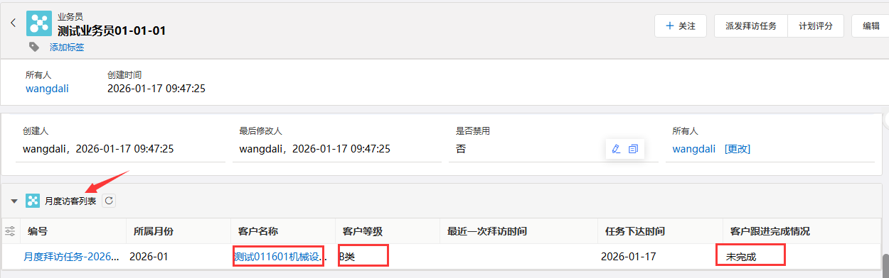 - 确认客户列表无误后,点击窗口中的 「保存」 按钮。任务即刻生效,并展示在该业务员的月度访客列表中,自动从客户档案带出客户等级,跟进情况默认为“未跟进”。