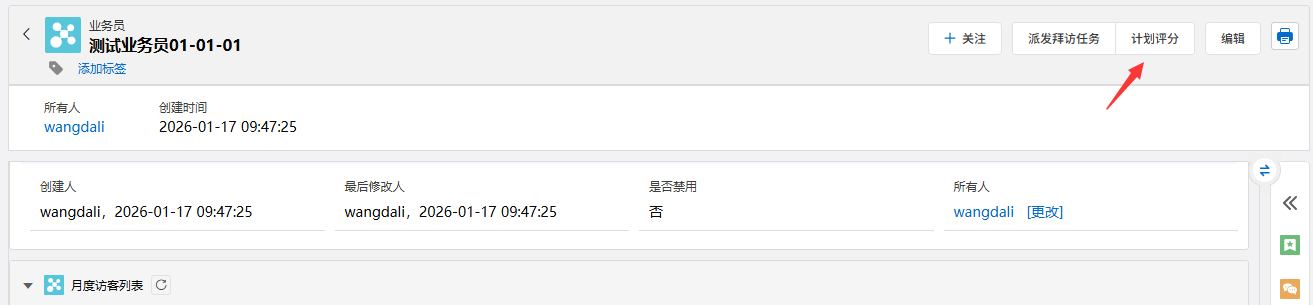 功能概述:“计划评分”功能是销售管理人员对下属业务员月度工作计划的完成质量与执行情况进行量化评估的管理工具。适用于销售经理在月度复盘或绩效考核周期,对业务员当月工作计划(如客户拜访量、商机推进节点等)的达成情况与质量进行正式评分。